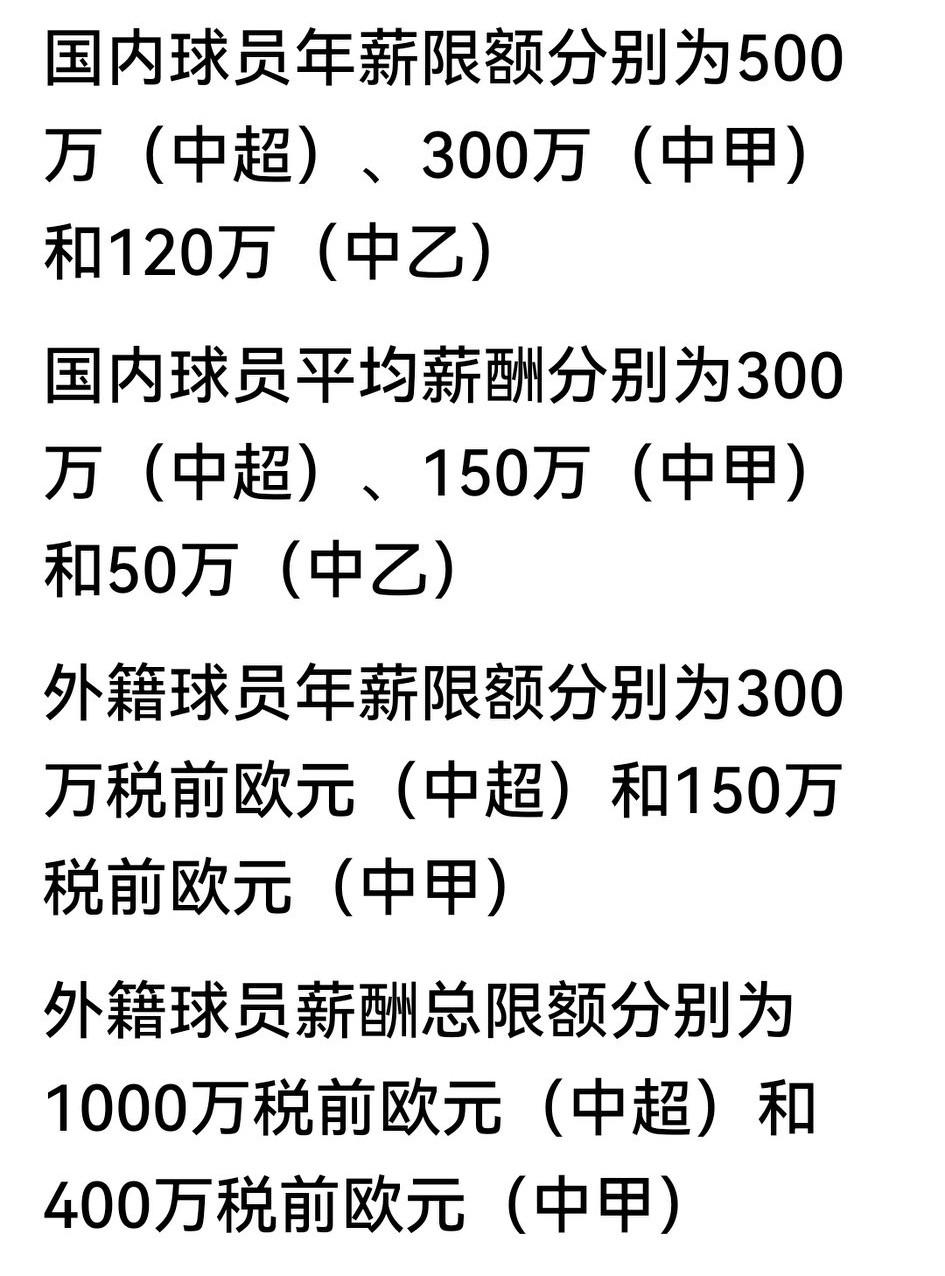 高,实在是高!中足联新限薪令一出,评论区竟无人叫好。 限薪令明确,国内球员顶薪:中超500w\中甲300w\中乙120w;外援顶薪:中超300万欧\中甲200万欧,均比此前大幅抬高。 并非网友犯了红眼病,而因国足已沦为亚洲三四流队伍,中超球队打亚冠更是一地鸡毛,球薪酬凭什么要拔高?