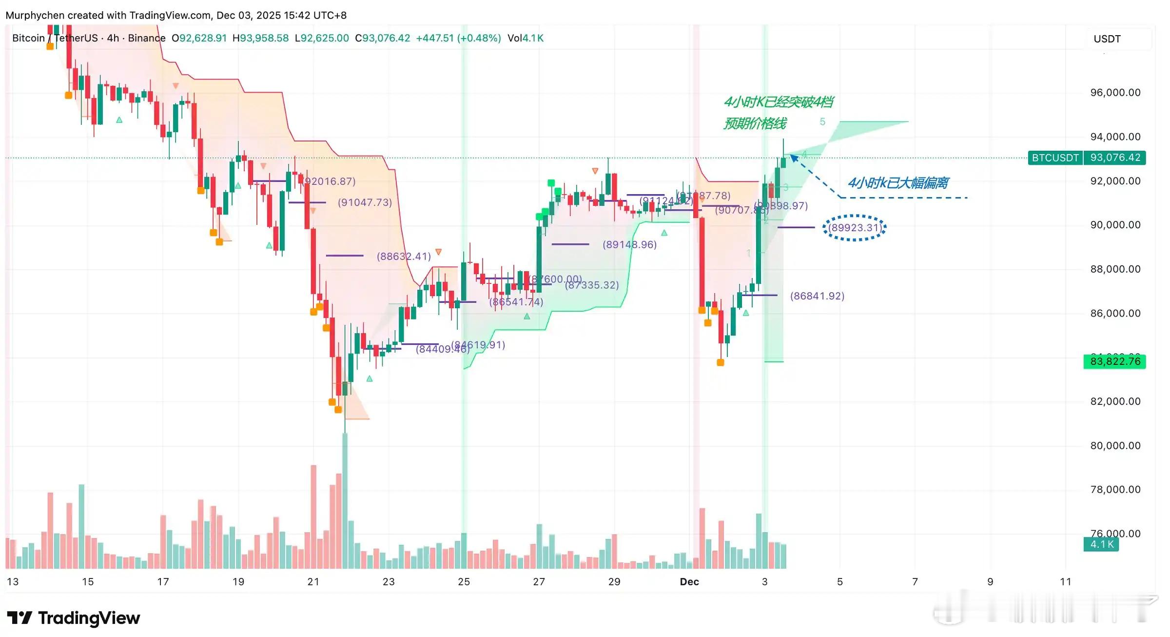链上分析师 Murphy 提醒大家,昨晚的比特币拉升力度非常猛,4小时K线已经明显偏离今天的标准线89,923美元,所以今天追多风险不小。价格目前已触及第4档预期线,晚上继续上攻难度较大。不过只要不跌破89,923美元,明天还是有顺势找机会的可能。日线K目前仍在看空趋势线下方,但已经很接近93,958美元,只要收线站上这一位置,指标就会转绿,意味着日线级别反弹行情可能开启。上方目标依次是95,604美元和99,108美元。短期内行情依旧看机会,但节奏要控制好。区块链BTCETH
