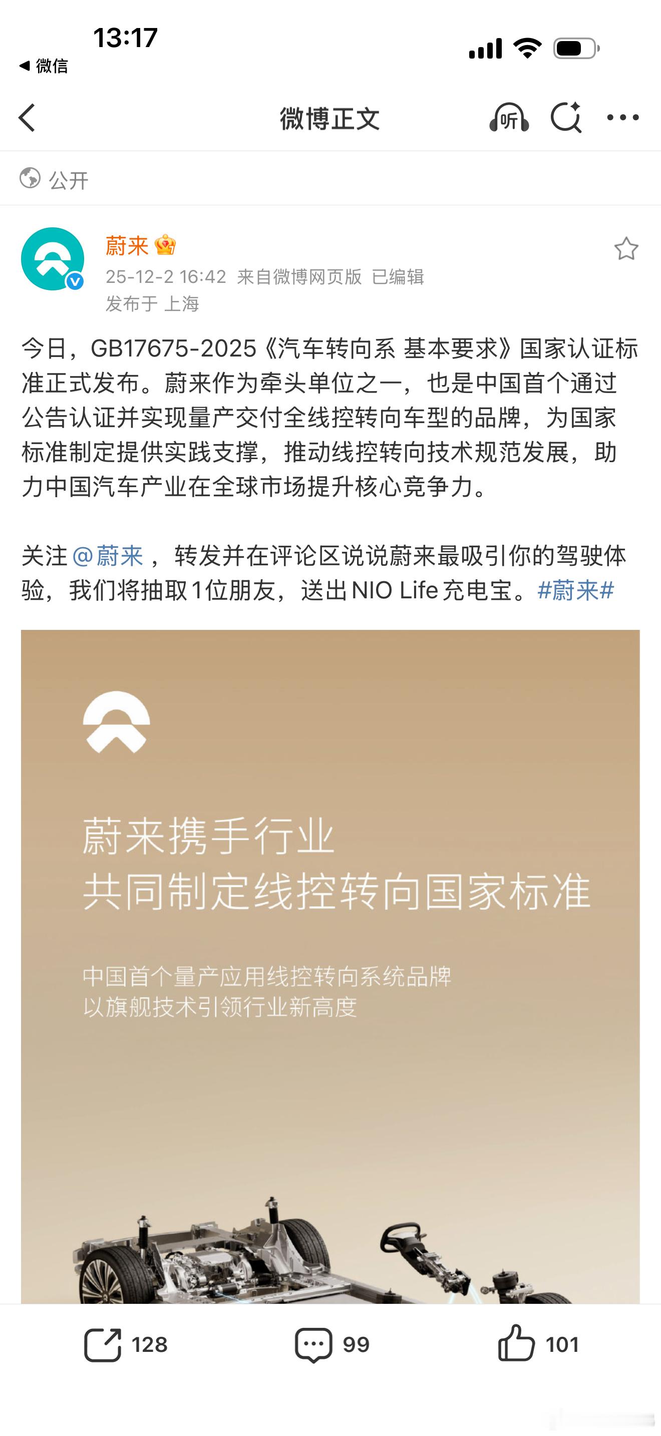 今日,GB17675-2025《汽车转向系 基本要求》国家认证标准正式发布。蔚来作为牵头单位之一,也是中国首个通过公告认证并实现量产交付全线控转向车型的品牌。朴实无华几句话,描述了一件不小的事。凑巧,我就是蔚来首批的线控转向用户,因为我有蔚来ET9。这车是我目前拥有新能源车辆中用料最佳,质感最佳,情绪价值最足的车没有之一。他的矩形方向盘造型新颖不挡视线,是线控转向技术最佳的可视化搭档。如果没有线控技术,无法安全且优雅的布置矩形方向盘。当你拥有了一个好用且安全的矩形方向盘,你就拥有了极佳的仪表视野和类似飞艇飞机等其他非陆地运载工具的独特体验。我日常驾驶ET9所谓的飞航感,不仅来自于天行全主动悬挂,还来自于线控和矩形盘这一先进组合。线控技术不仅拥有顶级的控车体验,其实也给整车座舱布置打来了一片新天地。我个人非常期待蔚来线控技术向更多车型普及电动兄弟