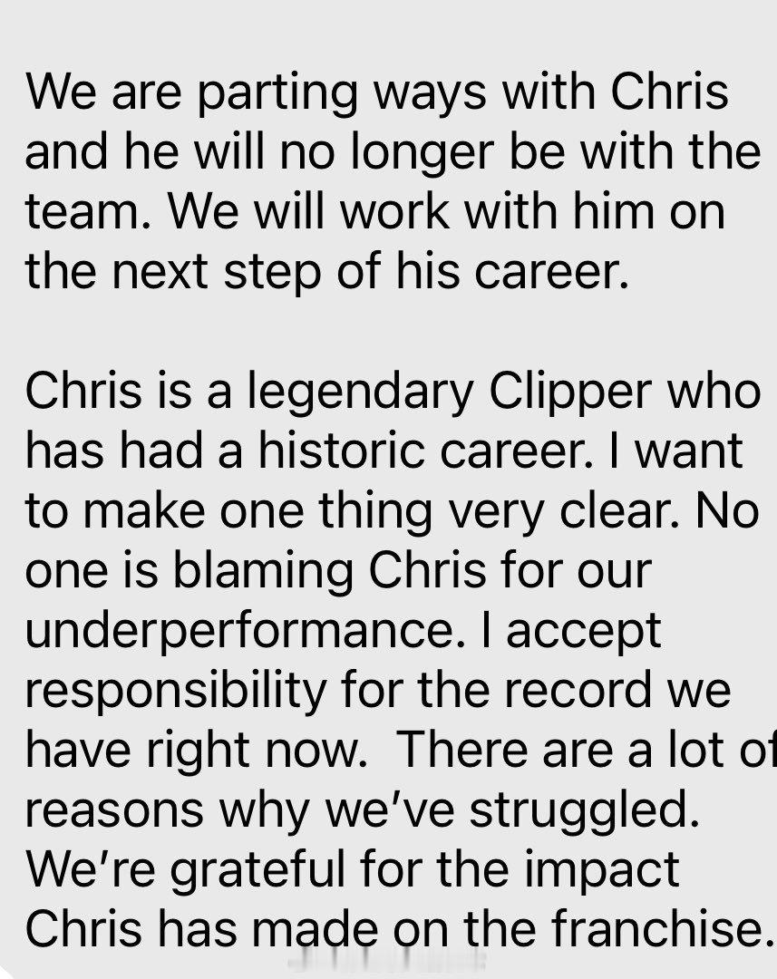 快船官方:“我们将与克里斯·保罗分道扬镳,他将不再是团队的一员。我们将协助他规划