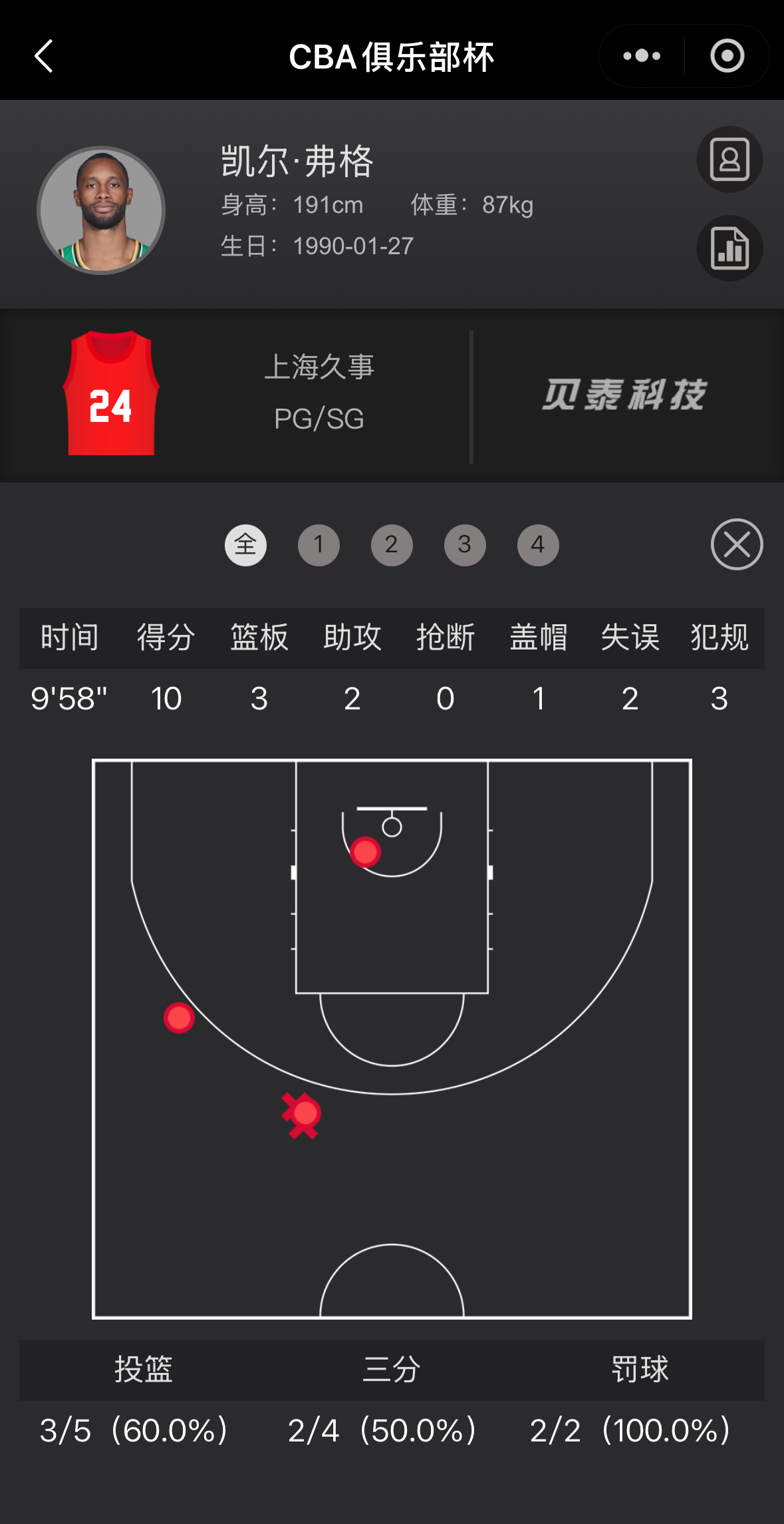 弗格上海队首秀出场9分钟58秒得到10分3篮板2助攻