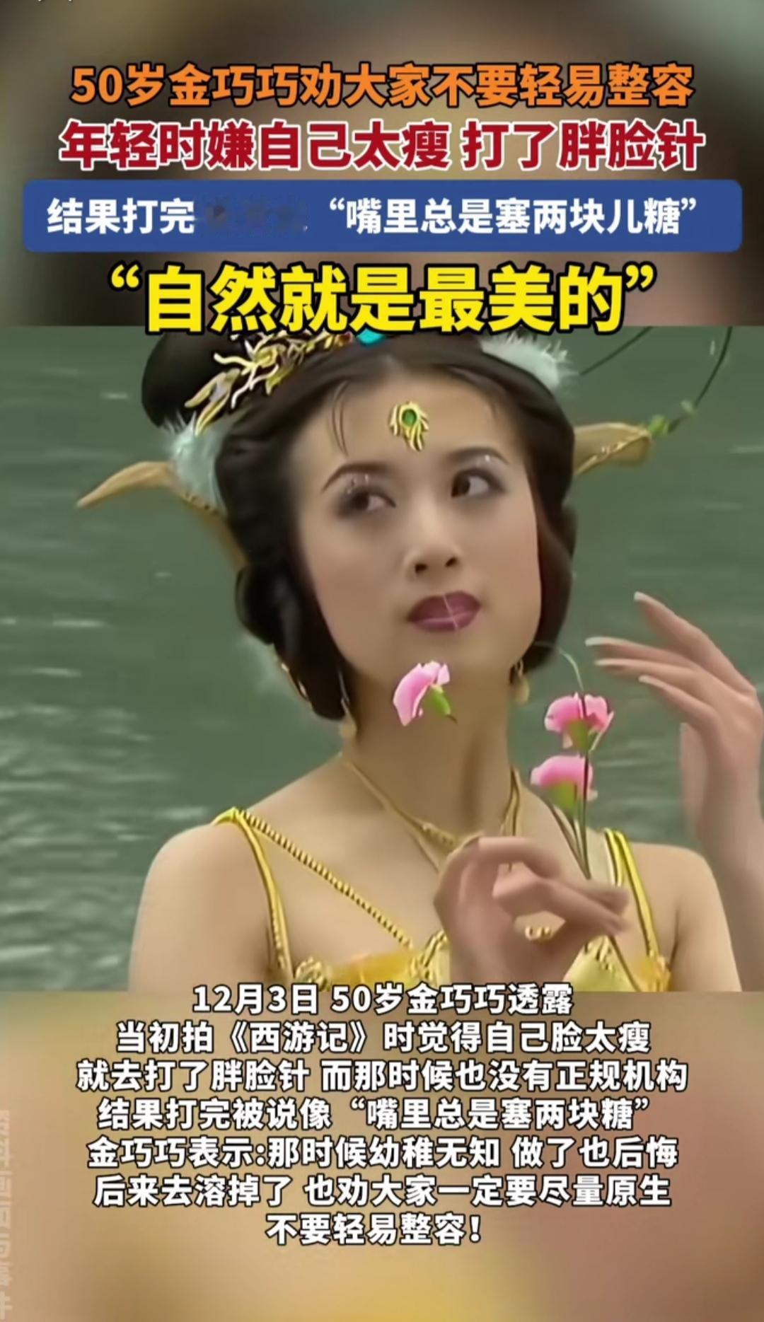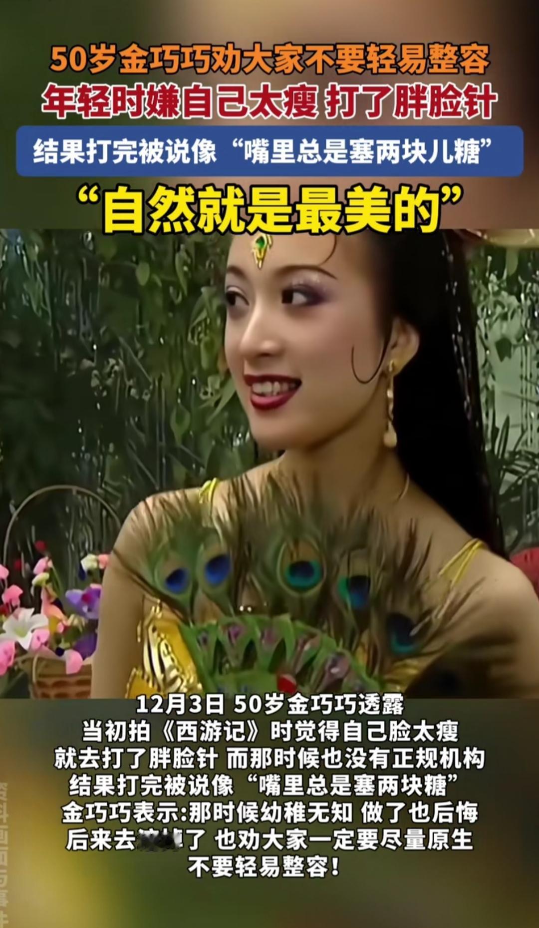 谁能想到,当年《西游记续集》里美出圈的孔雀公主,拍剧时居然偷偷整过容? 50岁的金巧巧12月3日在采访里说透了这段老底:拍剧时觉得自己脸太瘦,跟“孔雀公主该有的圆润贵气”不搭,就跟风打了早期的“胖脸针”。 可那时候医美行业还没规范,没找正规机构,打完脸直接肿得僵硬发亮,连观众都调侃她“像嘴里总塞着两块硬糖”,戏里镜头都得刻意避开侧脸。 后来她赶紧做了溶解修复,现在提起这事还直摆手:“那时候太幼稚,光想着变美,根本没顾风险,后悔到现在。” 经历过这一遭,她现在总劝年轻人:“原生的样子,哪怕有小瑕疵,也是最舒展舒服的美。现在医美坑更多,没摸清风险就瞎动脸,真的是拿自己的脸赌。” 你年轻的时候,有没有为“变美”踩过类似的坑?
