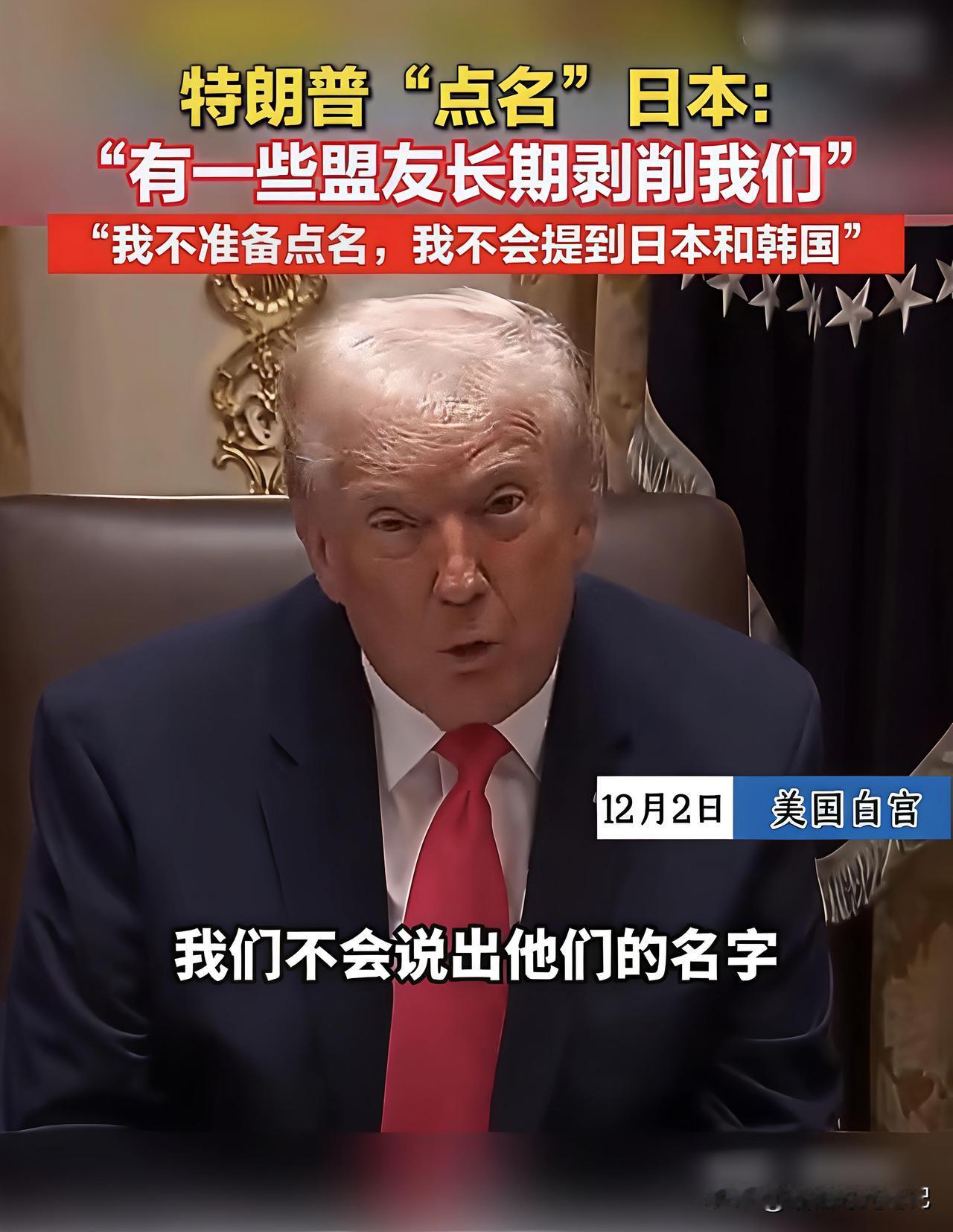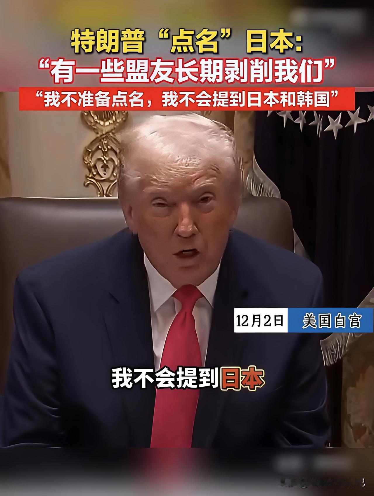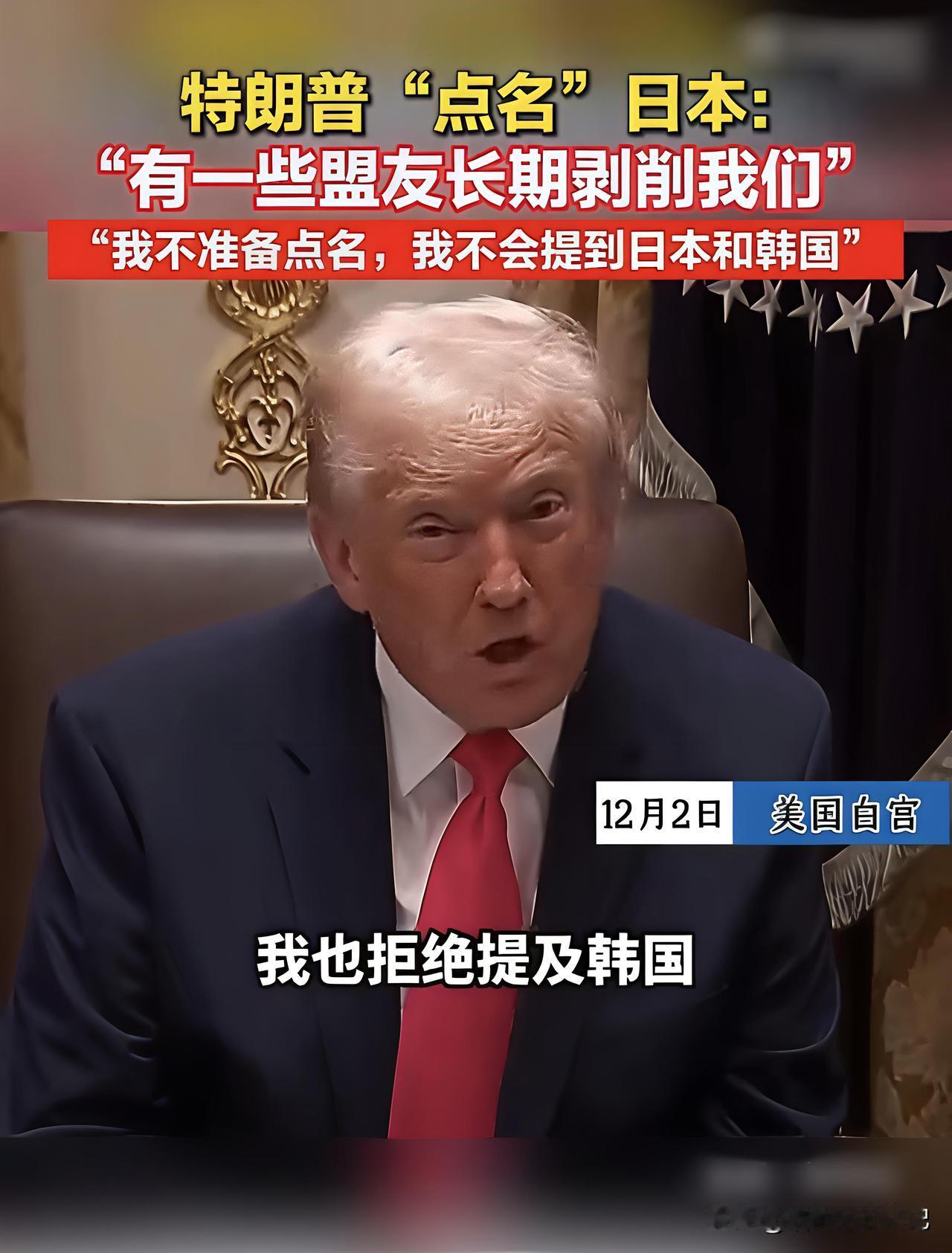 “我不会提到日本,我拒绝提到韩国。”当特朗普在白宫内阁会议上甩出这句“此地无银”的台词时,现场记者没忍住笑出了声。我脑海里瞬间浮现出岛国番组里“假装隐身”的整蛊环节:明明站在镜头前,却自我催眠“你看不见我”。只不过,这次被当成空气的是两位铁盟友,而舞台灯光打在了2025年的关税战上。 老特玩的依旧是“社交恐惧症式”外交:嘴上说不点名,手指却精准 东京。 一句“30年占美国便宜”,把汽车、大米、驻日经费全塞进了情绪炸药包——仿佛日本不是盟友。 他7月刚宣布8月1日起对日韩全部商品加征25%关税,如今又把“不点名”当人情,像极了先扇你一巴掌,再补一句“我可没打你哦”。 我看这出戏,核心只有四个字:选举流量。关税是红票仓的兴奋剂,盟友是现成的背锅侠。至于“日本被惯坏了”这种台词,翻译过来就是“怎么还没给我交足‘保护费’?”,连驻韩美军都想涨价到100亿美元,日本又凭什么例外?这操作像极了班主任罚站——我不点名,但你们心里没点数吗? 但 笑声背后,也别把东京当纯小白莲。高市早苗一句“台湾有事即日本有事”,配合自卫队向西南诸岛转移,算盘珠子早就拨得噼啪响。现在被老特当众“隐身羞辱”,只能说是把战略投机写在了脸上,却忘了盟友首先是生意伙伴——生意黄了,自然只剩“不点名”的嫌弃。 所以,这场“点名罗生门”没有无辜者:一方想收割选票,一方想薅羊毛,一方想借刀搅局。唯一被当成背景板的,是亚太老百姓对稳定的日常期许。 你觉得特朗普的“不点名”是战术羞辱,还是真打算再砍一刀关税?日本接下来会低头买美国大米,还是转身去谈RCEP优惠?欢迎评论区来聊聊。