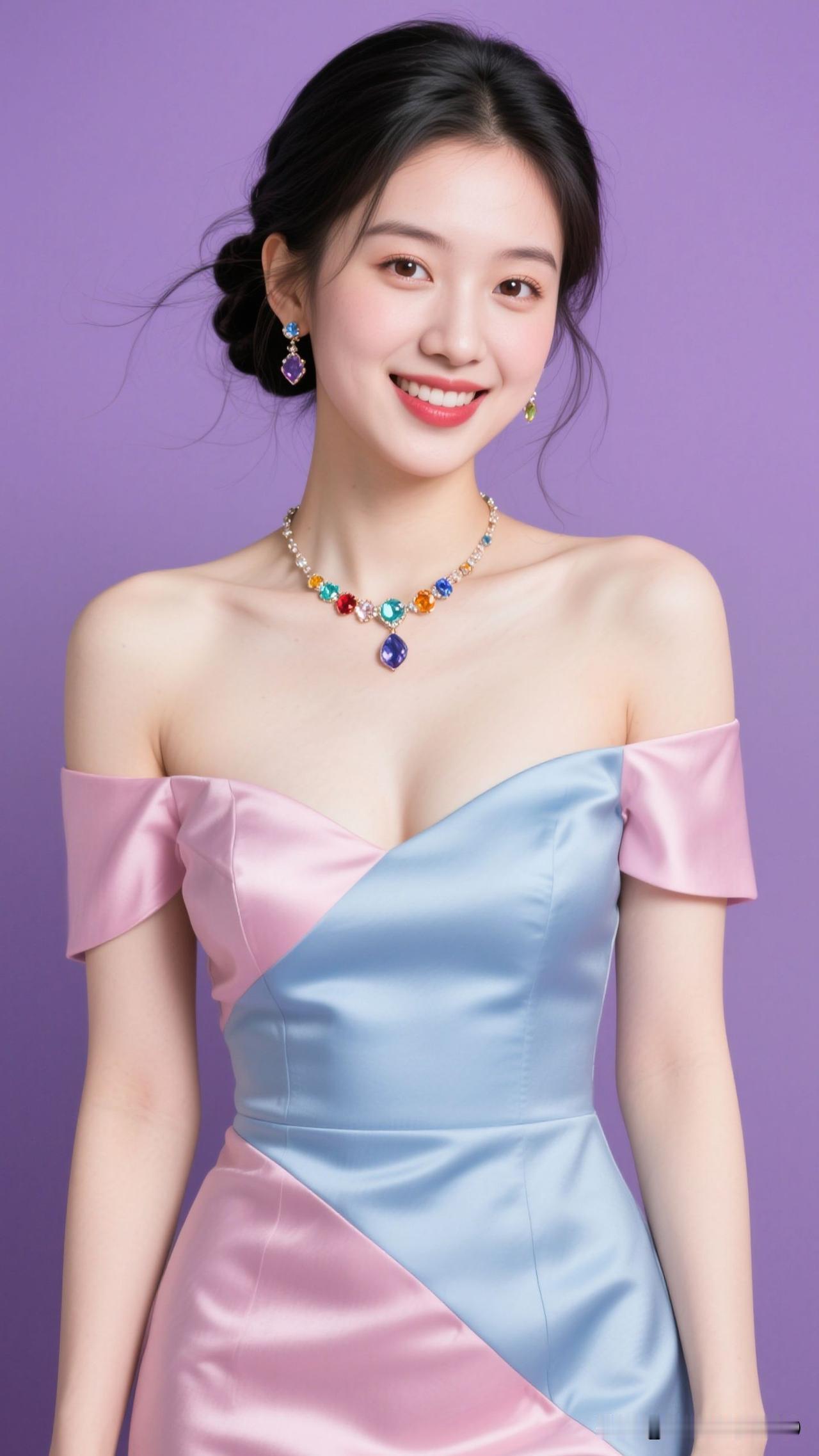🌸 墨色花影吻过白缎,钻石项链坠着月的清辉,笑意漫开时,浪漫便成了具象的诗。紫