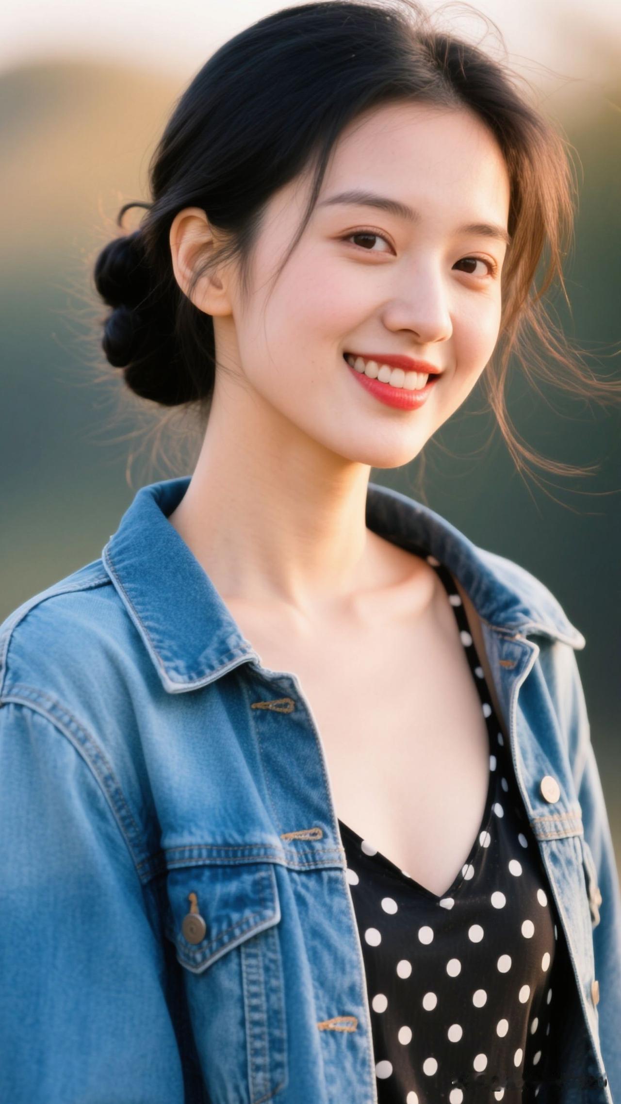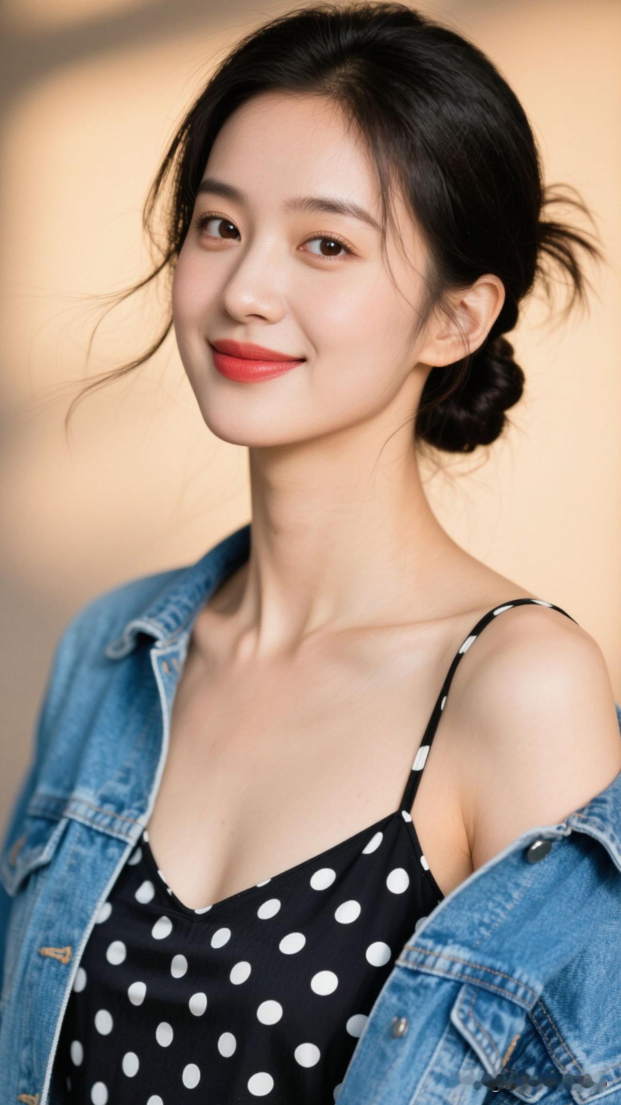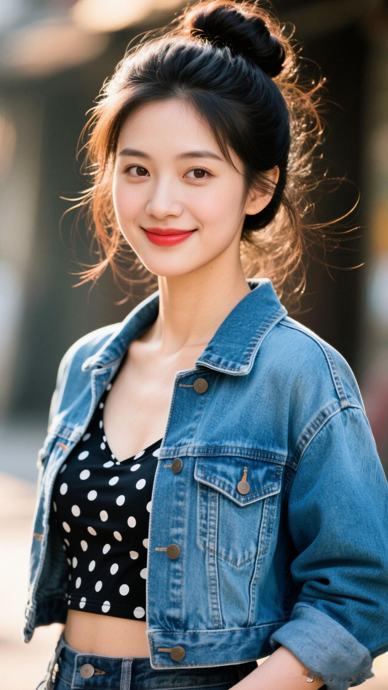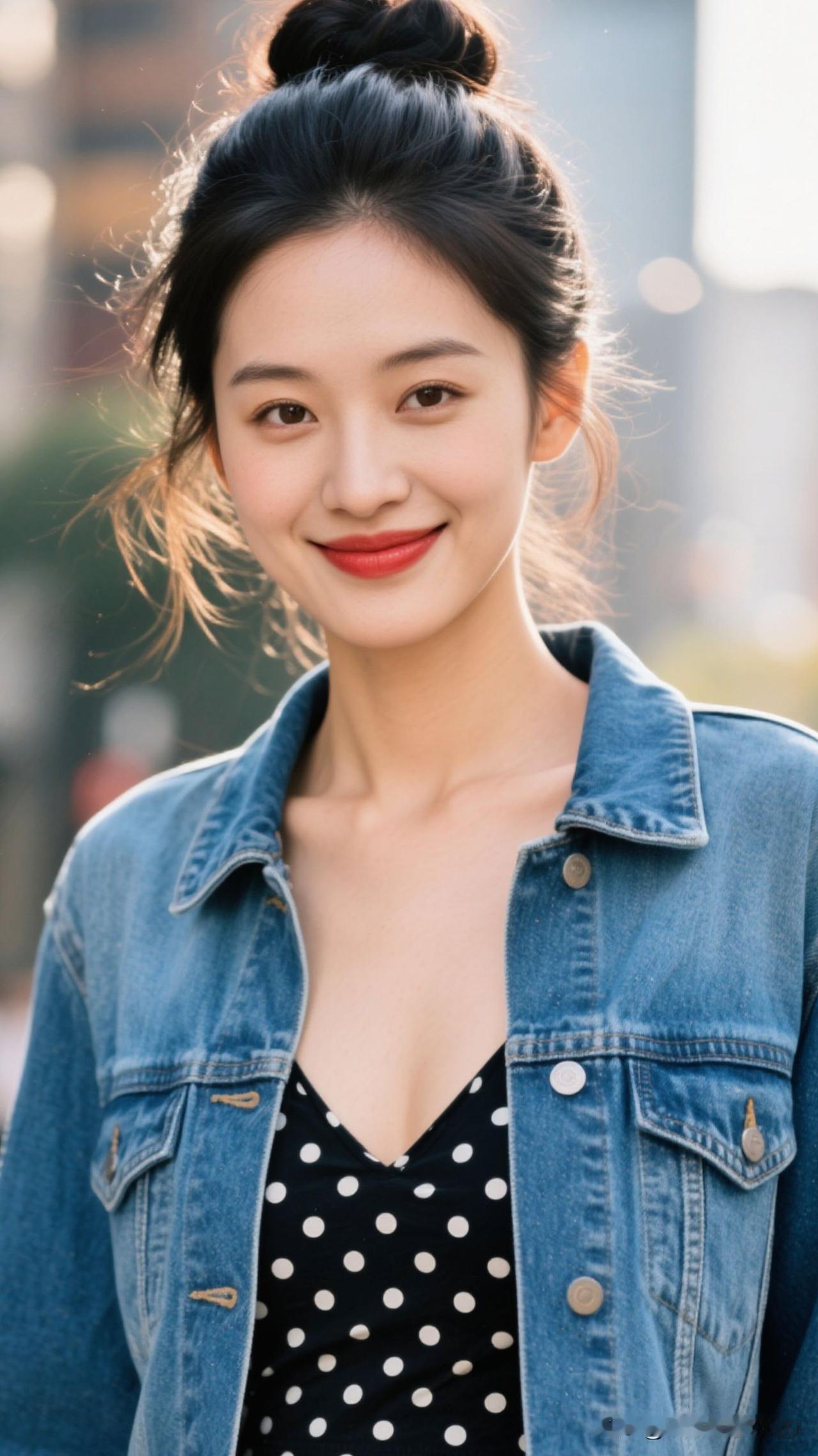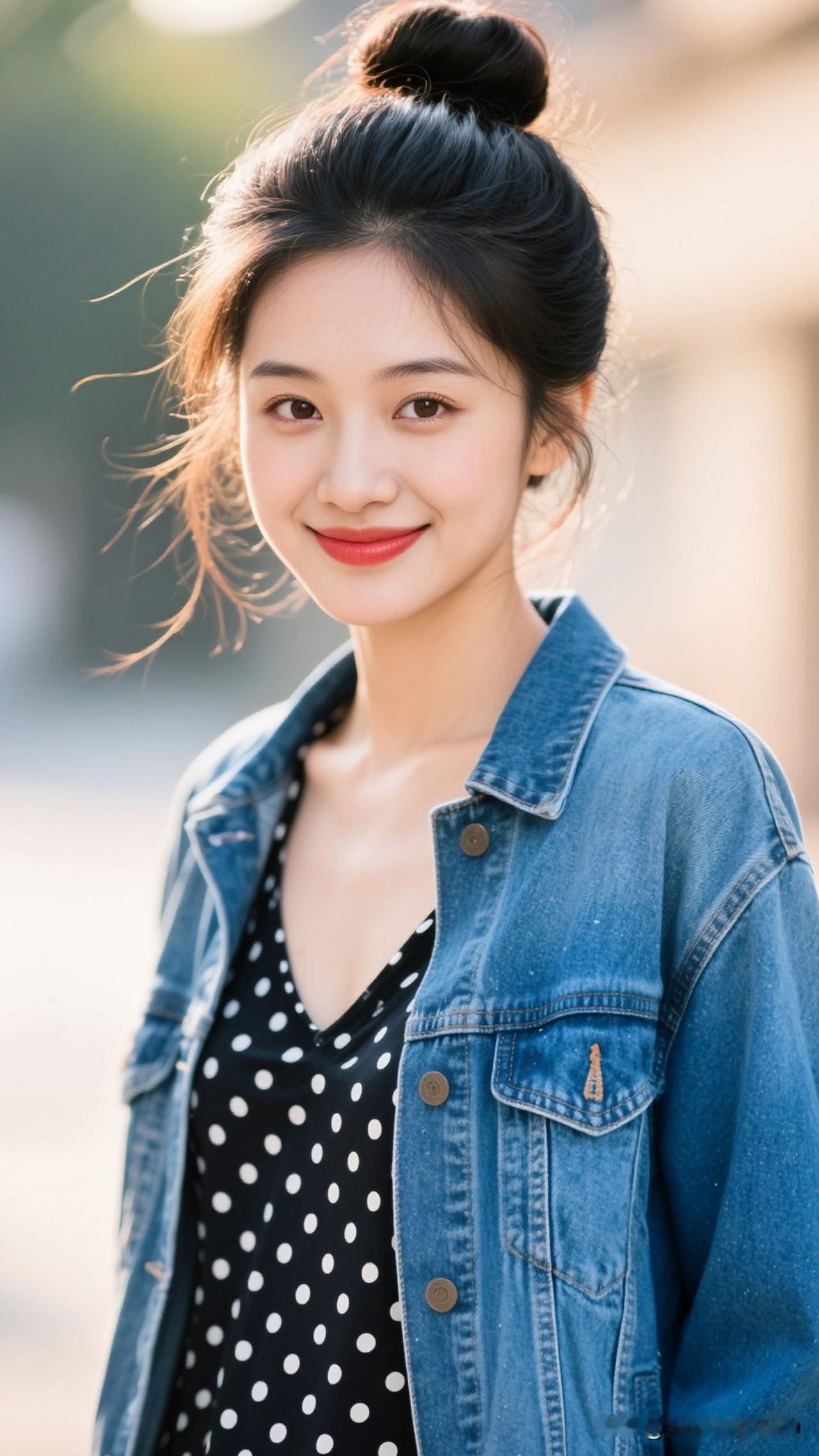 🌸 波点是揉碎的星子,牛仔是裁下的晴空,她一笑,连空气都浸着自由的甜。