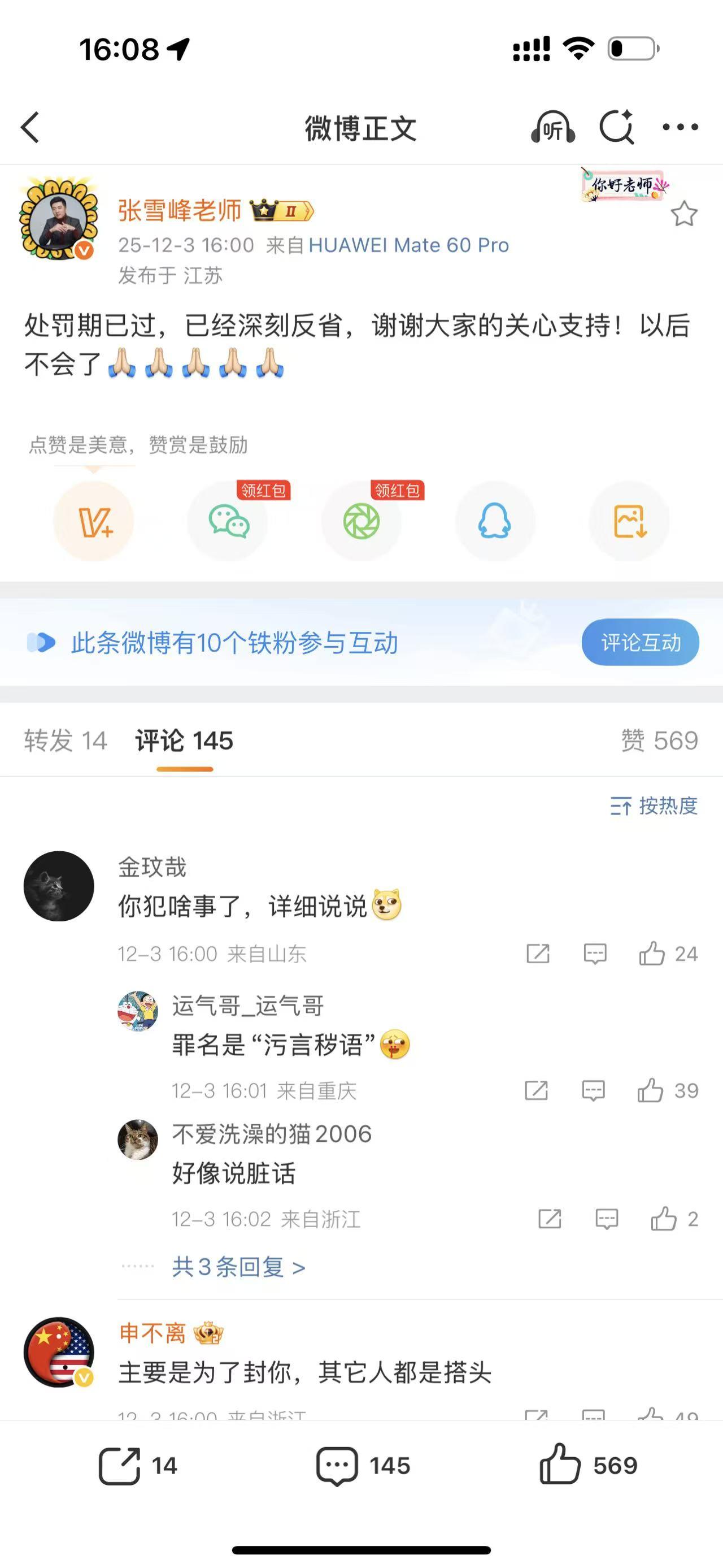 原来如此!高报老师张雪峰发文:处罚期已过,已经深刻反省,谢谢大家的关心支持,以后不会了。他这是犯啥事了吗?欢迎大家留言文明交流!