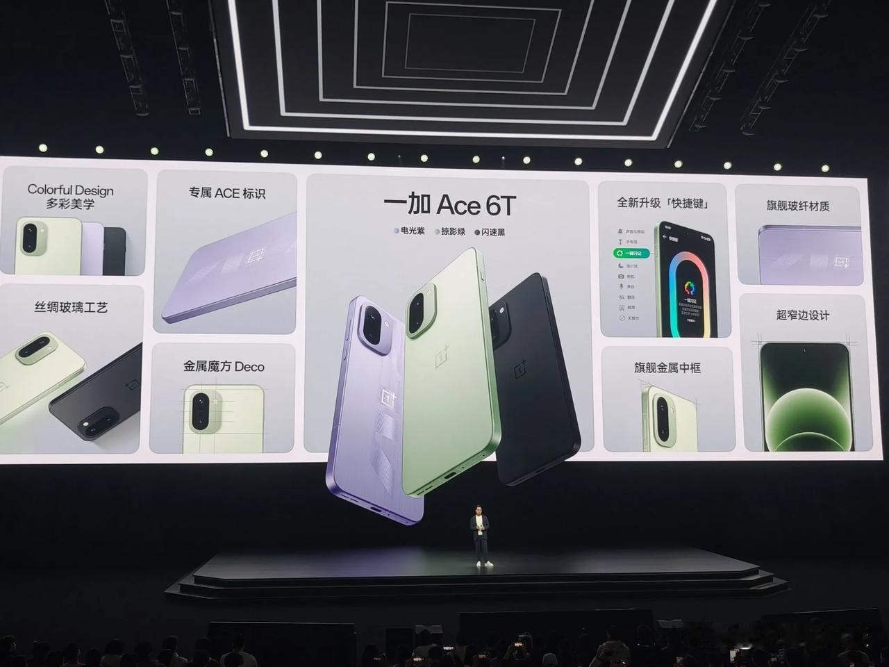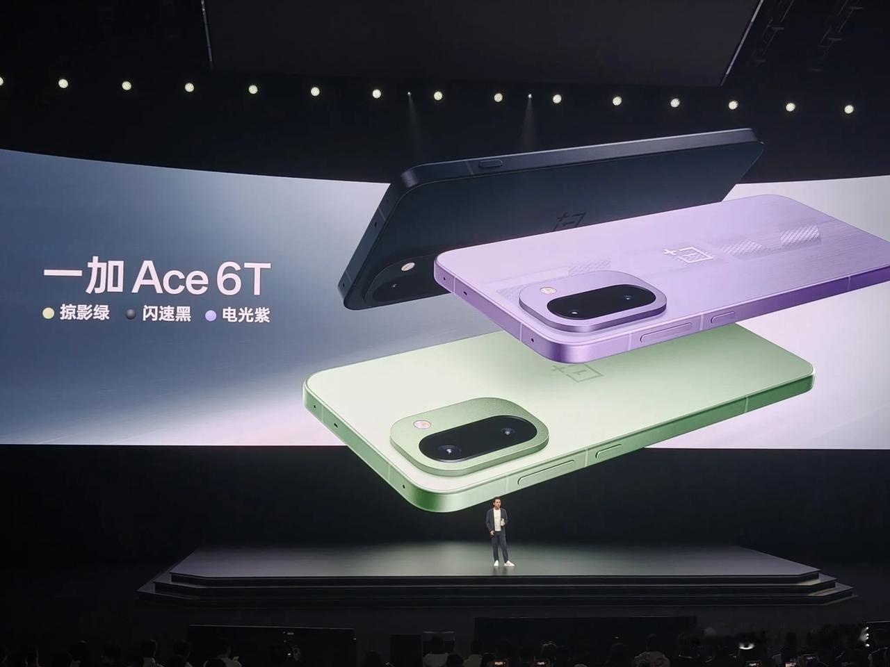 一加中国区总裁李杰:2025年一加手机销量同比增长42.3%,增速行业第一。10月底发布的一加15与一加Ace 6均获市场热捧,在京东等平台超99%用户给出好评。 今晚一加正式发布全新性能旗舰新选择 —— 一加 Ace 6T。该机型首发第五代骁龙8旗舰处理器,支持165Hz超高刷新率游戏体验,结合突破性的续航能力,真正实现“性能狠Pro,续航超Max”的产品定位,将全面普及高端配置标准化。 带来掠影绿、电光紫、闪速黑三款配色,延续简洁的设计风格,以Colorful Design多彩美学设计呈现全面旗舰质感。 一加Ace 6T整机背板干净清爽,金属魔方Deco精致好看,搭配圆润的“黄金R角”与高强度微弧金属中框,实现舒适的握持体验与轻盈坚固的质感。正面采用超窄边设计,视野超沉浸,⼤屏更尽兴;更有全新升级快捷键,新增九大功能,自由定义,方便好用。