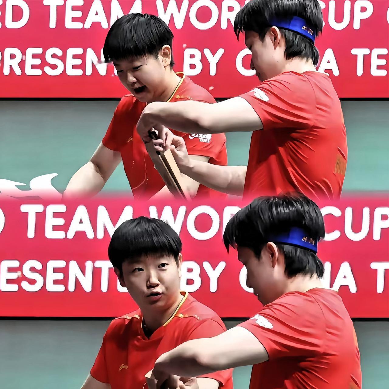 交拍子时 莎莎的嘴就没停过, 估计又拽着大头现场复盘了! 学霸不愧是学霸, 3:0轻松拿下也不忘立刻“查漏补缺”。 今天两人配合行云流水, 莎莎一个调动把对手“骗”到一起, 大头跟上就是一板暴抽, 好一个“你挖坑,我填土”, 节奏扣得死死的。 根本不需要眼神交流, 每一步都像提前说好了, “混双老祖”的默契真不是吹的! 肖指导今天也在场边坐着呢, 这俩徒弟打得太顺了, 真是给教练组挣足了面子!