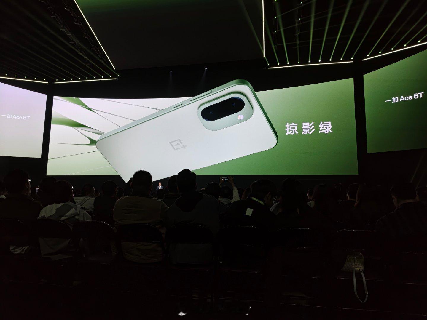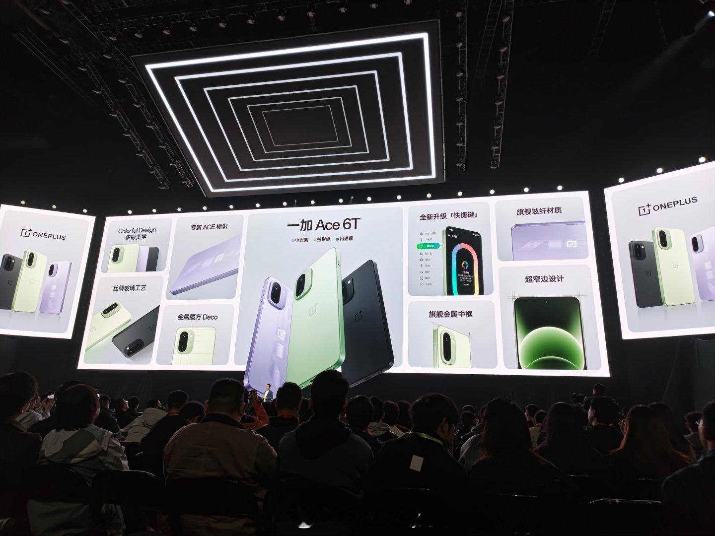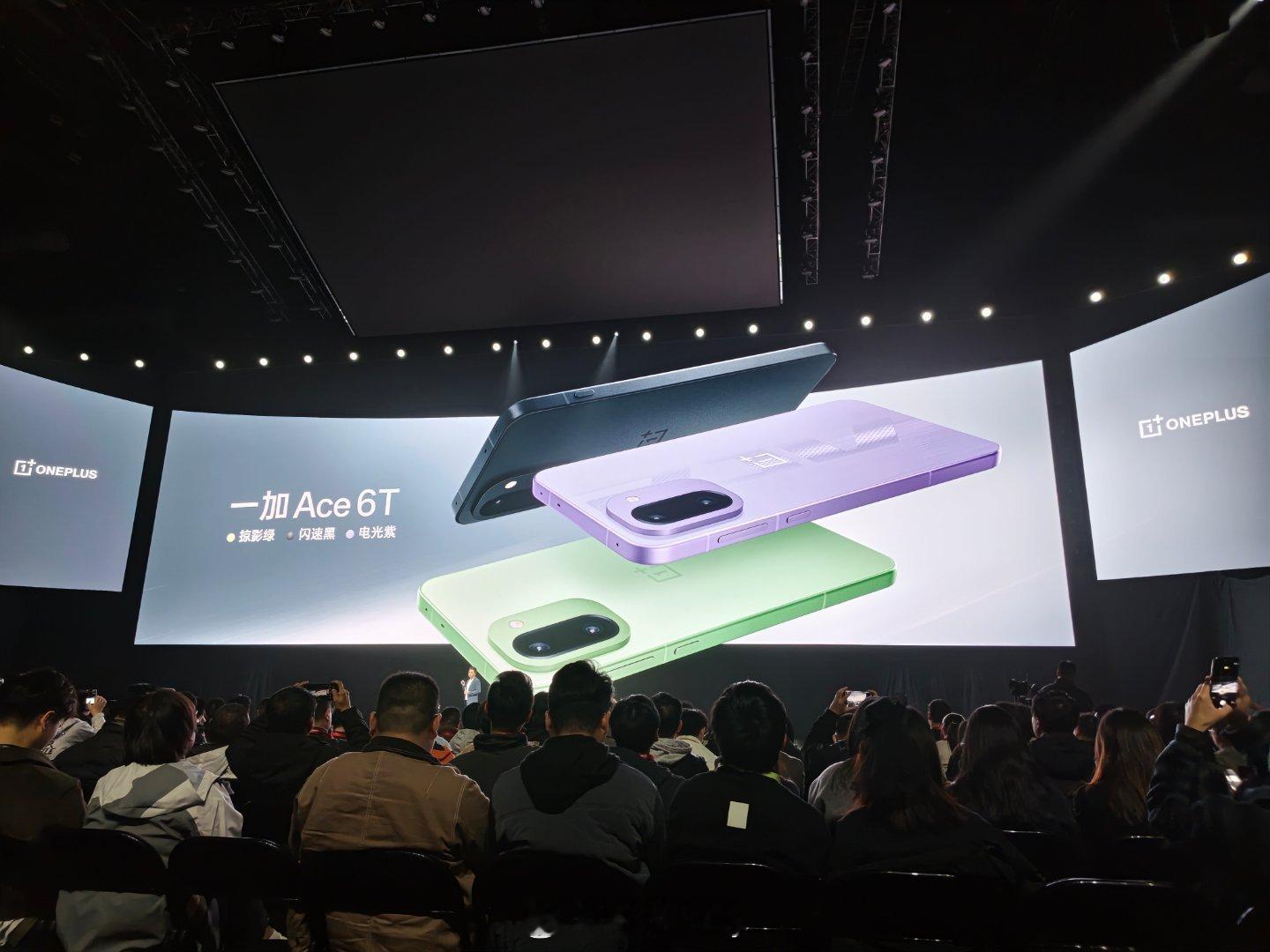 一加Ace6T带来掠影绿、电光紫、闪速黑三款配色;整机背板干净清爽,金属魔方Deco精致好看,正面采用超窄边设计,视野超沉浸,⼤屏更尽兴!一加Ace6T新品发布