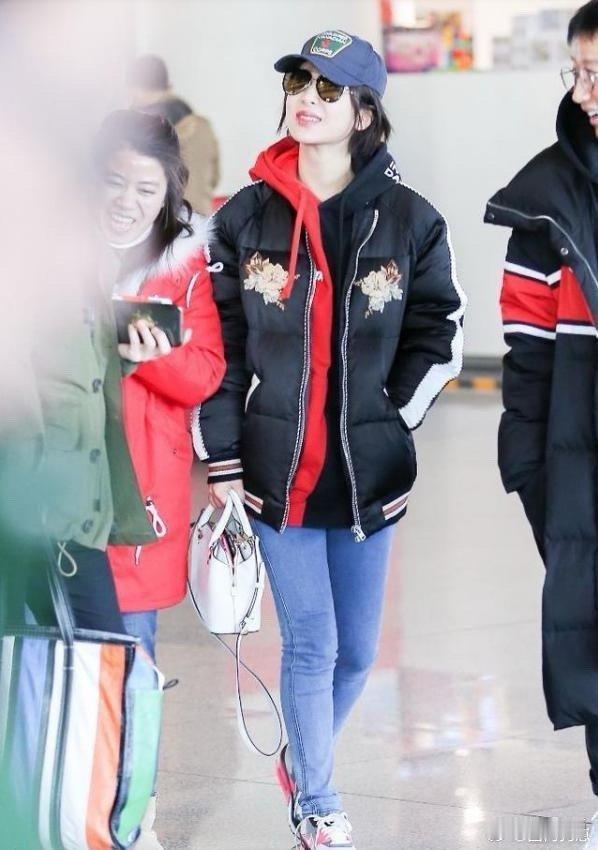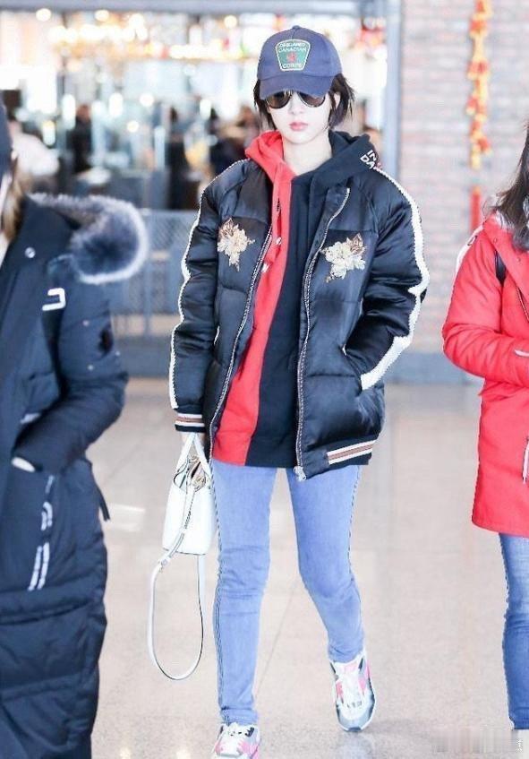 杨紫的机场私服越来越会穿了!黑色短羽绒服叠穿拼色卫衣,又减龄又显高级,时髦感直接拉满~