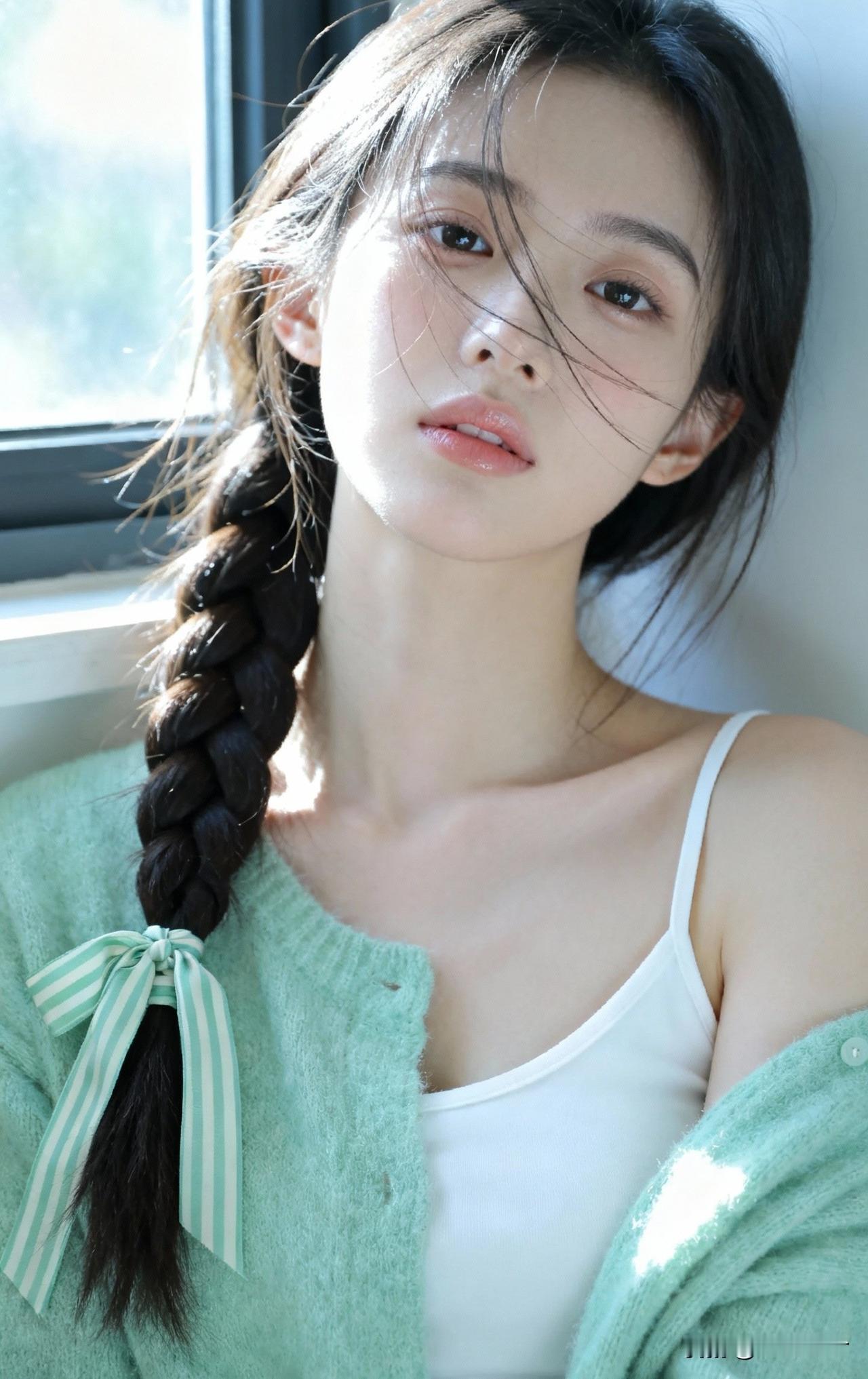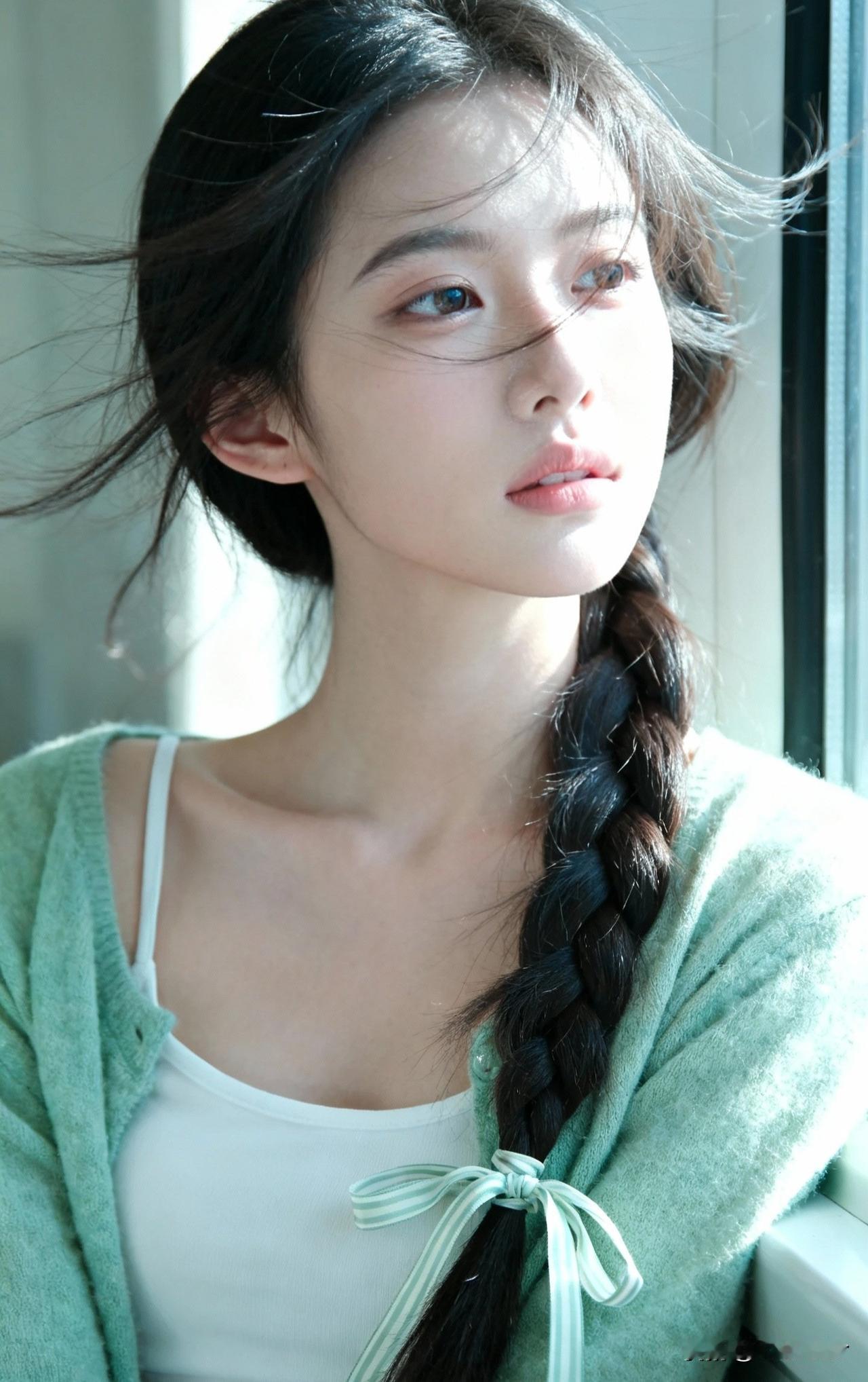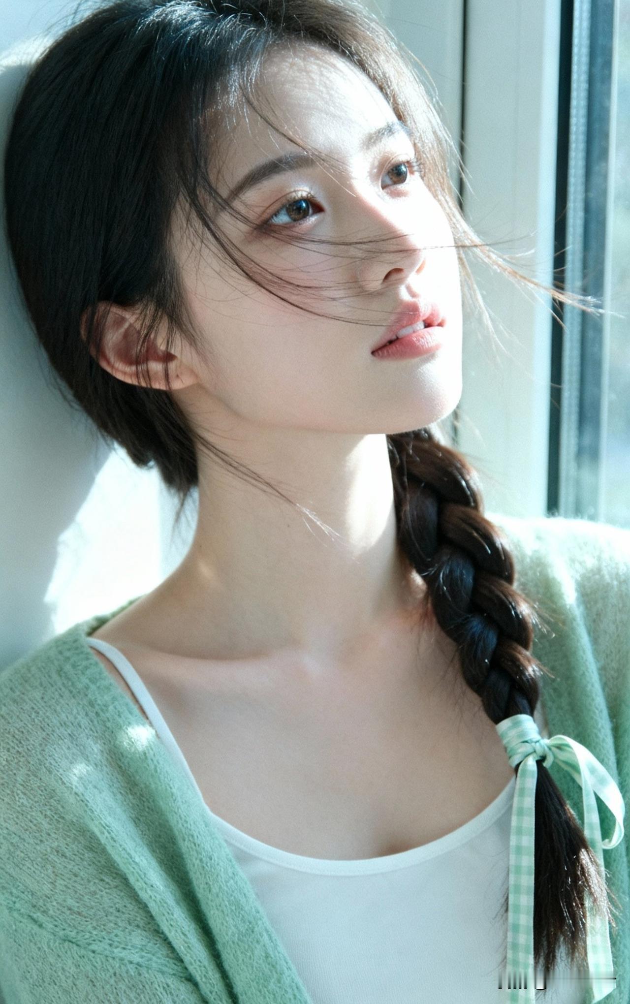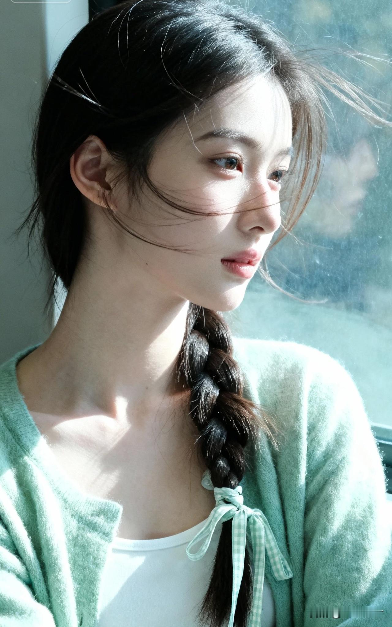 窗前美人倚,发丝如墨流。