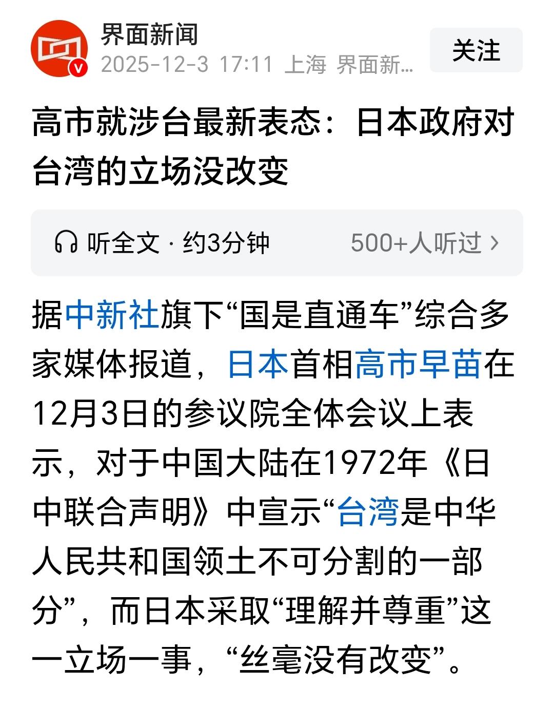 搞事毒苗在国会公开表示,日本政府在台湾问题上的立场没有改变。 这才多久就坚持不下去了? 别呀。大家都在为你浇油呐喊啊。怎么就公开重新表态了呢? 但是你猜我们会收手吗? 这件事不是收回谈话就能够解决的,你现在只是表达了日本政府的立场,但是你没有说撤回台湾有事就是日本有事的说法呢。 既然你不明确撤回,我们也会装着看不到哦。 琉球的故事没有完,敌国条款也没有完,《波茨坦公告》规定的事也还没有完……慢慢来。 点右上角关注我,我们一起去看这个魔幻的世界