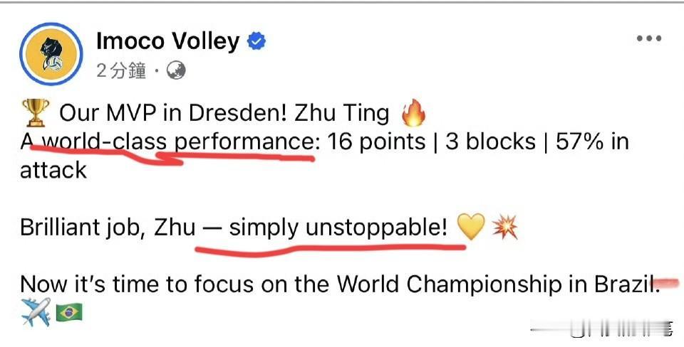 科内利亚俱乐部用这两个形容词称赞朱婷:word-class,simply unstoppable 的确,昨晚比赛中朱婷不仅承担了全队最多的一传,还多次成功扣下难度极高的调整攻,同时拦网拿分最多,总得分也最多,可谓冠绝群芳。 所以,俱乐部毫不吝啬地称赞她:世界级水平,进攻势不可挡。 加油✊朱婷,继续保持好状态。朱婷 朱婷意甲数据