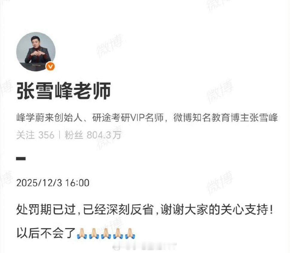 张雪峰称已经深刻反省张雪峰在直播中长时间使用污言秽语,相关账号已限期禁言、停播。罪有应得,自作孽,不可活!张雪峰发文回应被通报处罚:”处罚期已过,已经深刻反省,谢谢大家的关心支持!以后不会了。”网络不是法外之地,饭可以乱吃,话不能乱讲啊!网络名人账号违法违规行为被查张雪峰30天掉粉近13万