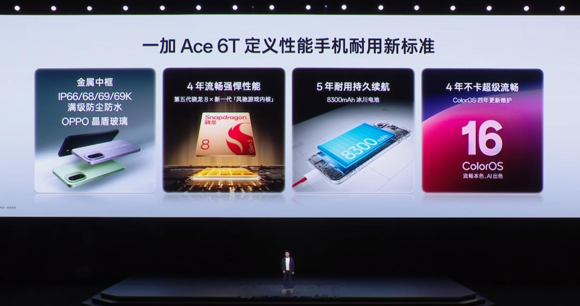 外围配置也给到位了,一加 Ace 6T 支持 IP66/68/69/69K 满级防尘防水,3D 超声波指纹,OPPO 晶盾玻璃,全新 ColorOS 16。