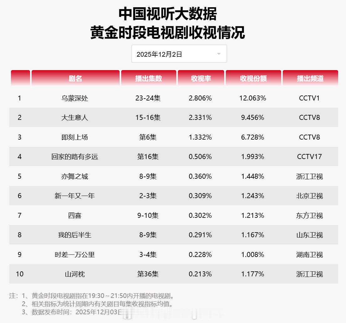 【2025年12月02日中国视听大数据CVB黄金档电视剧收视率日榜TOP10】1 乌蒙深处 CCTV12 大生意人 CCTV83 即刻上场 CCTV84 回家的路有多远 CCTV175 亦舞之城 浙江卫视6 新一年又一年 北京卫视7 四喜 东方卫视8 我的后半生 山东卫视9 时差一万公里 湖南卫视10 山河枕 浙江卫视
