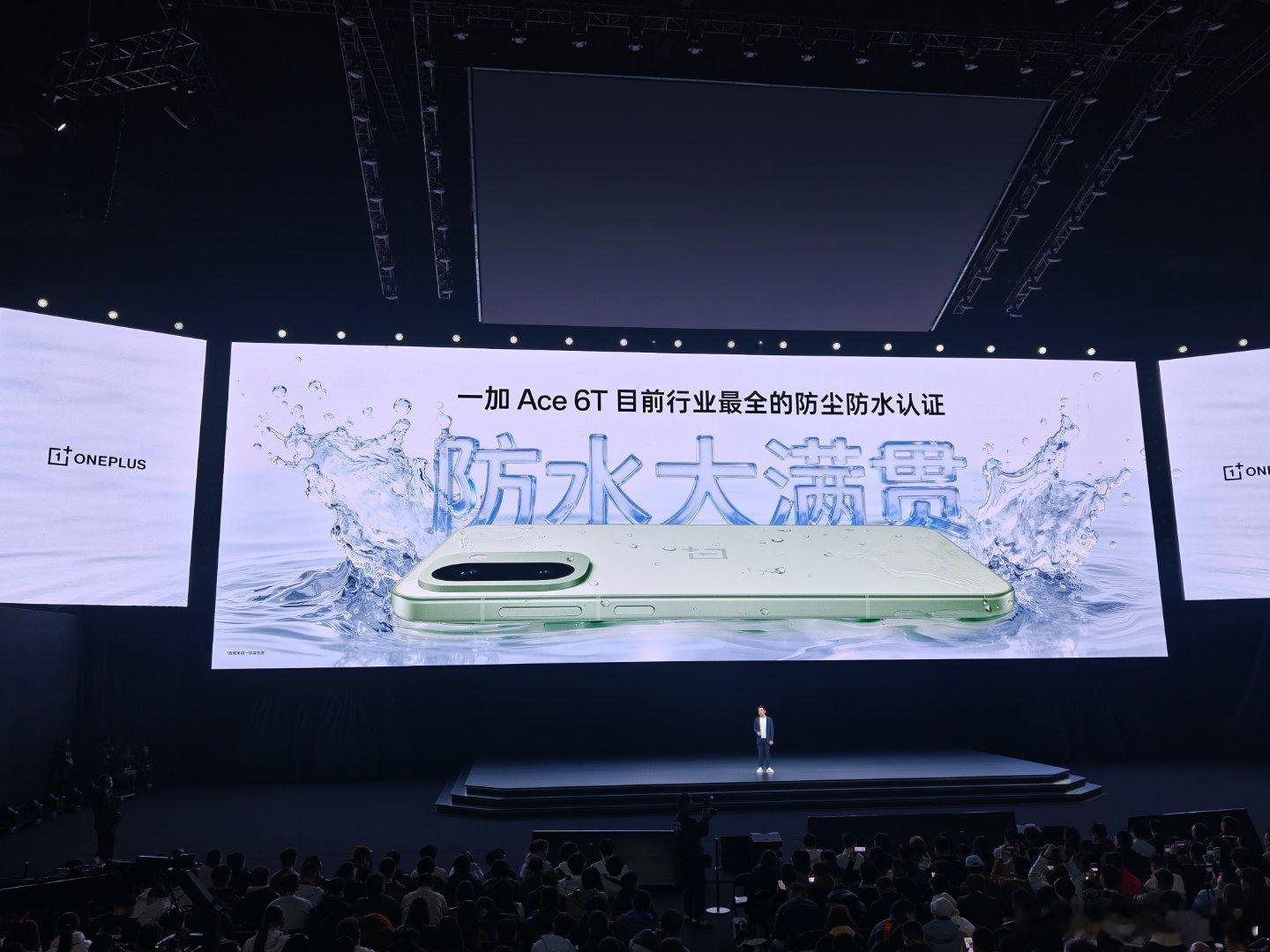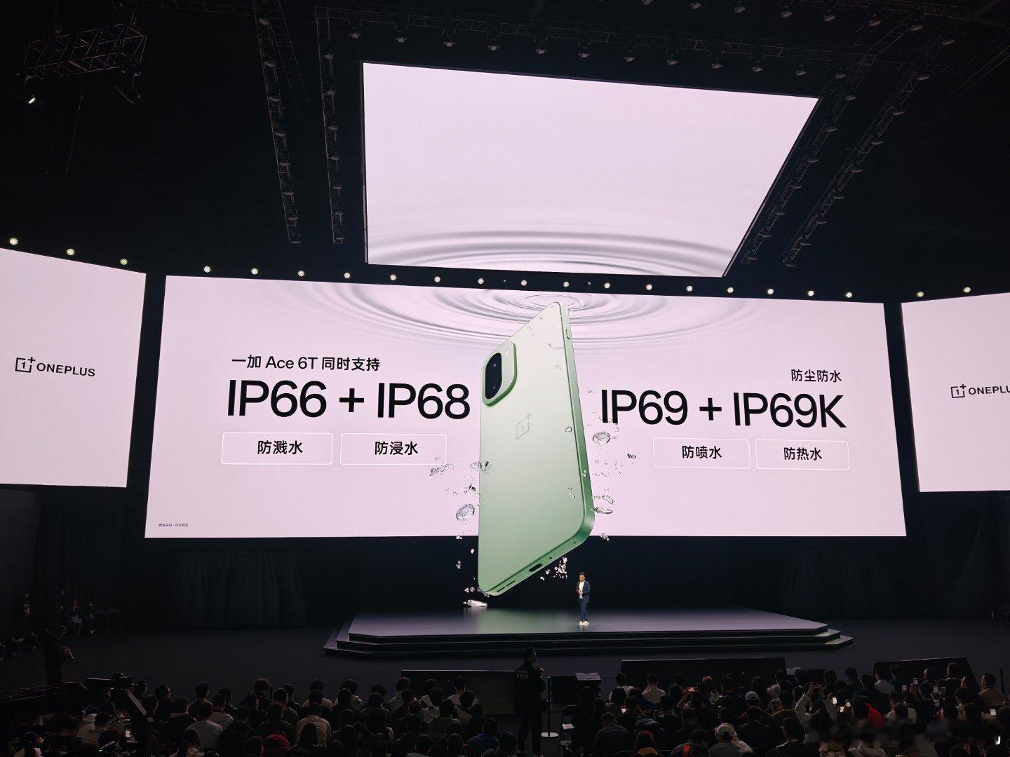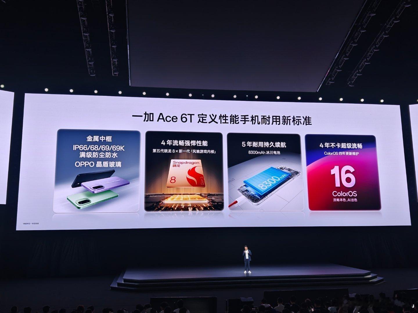 一加Ace6T 以全方位耐用实力,重新定义性能手机耐用新标准。针对手机日常使用中常见的沾水,刮擦,掉落等小意外,一加 Ace 6T拥有目前行业最全的IP66/68/69/69K防尘防水“大满贯”认证,无惧泼水、浸水,甚至热水、蒸气,配合雨水触控2.0,湿手操作依然灵敏;搭载超耐磨超抗摔 OPPO 晶盾玻璃,抗摔性能提升 160%,抗刮伤性提升 300%,真正做到不贴膜也安心;金属中框坚固耐摔,轻松应对意外跌落。不止物理层面的“耐用”,⼀加 Ace 6T通过软硬件双重优化,真正实现了四年持久流畅耐用:第五代骁龙 8 旗舰芯与新一代风驰游戏内核的深度融合,强悍性能,四年流畅;续航十冠王8300mAh 超巨量冰川电池,持久续航,五年耐用;ColorOS 四年更新维护,功能持续升级,保障超级流畅,四年不卡。一加Ace6T新品发布你用过165Hz手机打游戏吗