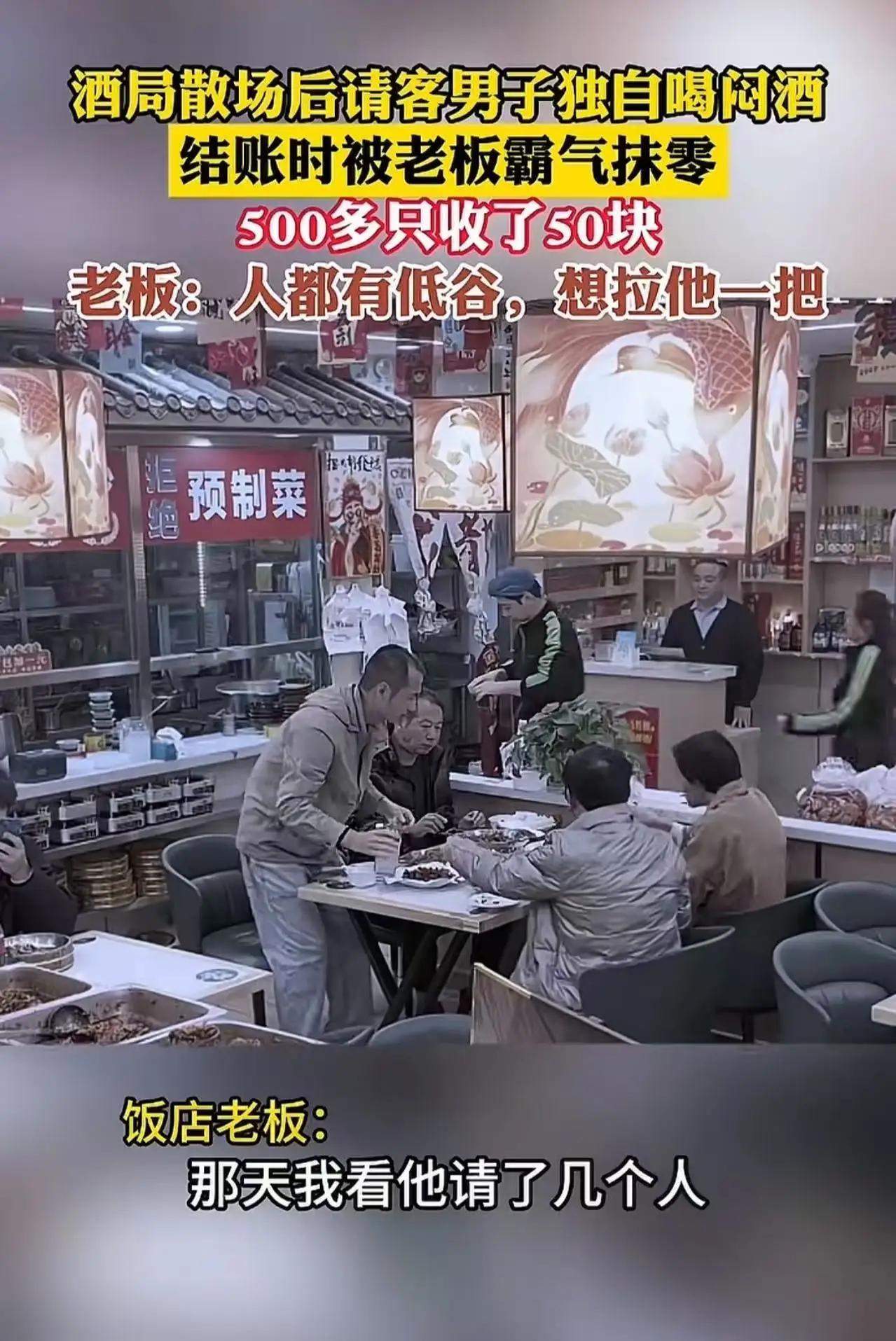 那一晚,男子独自坐在酒吧的角落,满脸的疲惫与无助。他原本只是想借个面子,借个朋友的力量,想把那些借出去的钱收回来,毕竟那些钱也代表着他曾经的信任和期待。可是,没想到一提到还钱,朋友立刻变了脸色,像是被踩到尾巴的猫,匆匆逃跑。那一瞬间,男子的心像被刀割一样,所有的希望都碎了一地。 他端起酒杯,闷闷地喝着,试图用酒精麻痹自己的心绪。酒精的味道苦涩,就像他此刻的心情,充满了失落和无奈。就在他沉浸在自己的世界时,老板走了过来。 老板是个中年男子,眼神中透着一股洞察人心的温暖。他没有多说什么,只是默默地把账单放在桌上,然后霸气地抹掉了560块钱的账单,只留下了56块钱。“人都有低谷的时候,想拉他一把。”老板的话简单,却直戳人心。 这句话像一股暖流,瞬间冲散了男子心头的阴霾。或许,他的朋友的逃跑只是暂时的迷失,而自己曾经的信任也许还值得再给一次机会。老板的这份善意,像是一束光,照亮了男子心中那片阴暗的角落。 其实,这个世界上,真正的朋友不一定是那些在你风光时陪你喝酒的人,而是在你低谷时愿意伸出援手的人。有人说,善意是一种无声的力量,它不需要任何回报,只要你愿意付出,就会在不经意间温暖他人,也温暖自己。 或许,男子的故事只是千万个普通人的缩影。我们都曾在某个瞬间感受到过被背叛的痛,也都渴望那份无条件的善意。生活或许会让我们跌倒,但只要心中有一份善良,就能在黑暗中找到光明。 这件小事,或许只是一个简单的酒局,但它折射出的是人性最温暖的一面。我们都在寻找那份“拉一把”的勇气,无论是对朋友,还是对自己。善良,从不需要理由,只要你愿意。 所以,下次当你遇到身边的人需要帮助时,不妨想想那个老板的举动。也许,你的善意会成为他人生中的一束光,照亮他前行的路。毕竟,世界需要更多像他一样,愿意用行动温暖他人的人。