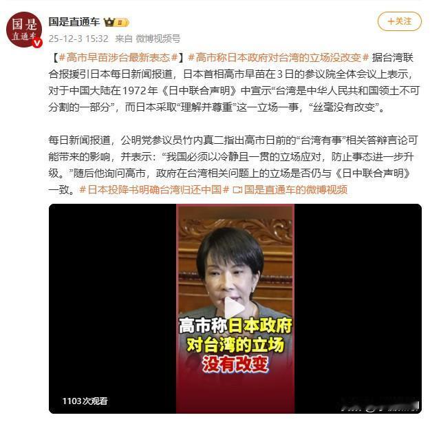 高市早苗重申一个中国! 今天最解气的消息来了:日本首相高市早苗在参议院全体会议上明确表态,日本对台湾的立场完全依据1972年《中日联合声明》,“理解并尊重台湾是中国领土不可分割的一部分”,这一立场“丝毫没有改变”! 要知道,就在不久前,这位日本极右翼政客还公然叫嚣“台湾有事即日本存亡危机事态”,暗示要武力介入台海,引发两岸同胞强烈愤慨,连日本国内有识之士都集会抗议,要求她撤回错误言论。 如今突然重申一个中国原则,看似矛盾的背后,实则是大势所趋的必然,中国的强硬反制、国际社会的普遍共识、历史法理的铁证如山,让任何企图分裂中国的妄想都沦为泡影。 最讽刺的莫过于台湾民进党当局。此前高市早苗发表涉台挑衅言论时,赖清德还特意晒出吃日料的照片“力挺日本”,民进党人更是组团赴日献媚,结果转头就被日本首相“打脸”,岛内网友直言“日料白吃了”“这一巴掌打得响亮”! 其实明眼人都清楚,“台独”势力妄图抱外国大腿分裂国家,不过是饮鸩止渴。从《开罗宣言》《波茨坦公告》明确台湾归还中国,到联大第2758号决议奠定一个中国的国际地位,再到183个建交国共同恪守一个中国原则,台湾属于中国的事实早已刻在历史里、写在法理上、印在国际社会的共识中。 有人可能会问,高市早苗的表态是真心还是假意?其实无论其背后有怎样的政治考量,至少再次印证了一个铁律:任何国家都不敢公然违背一个中国原则,任何分裂中国的行径都注定失败。中国人民捍卫国家领土完整的决心和意志,比山还坚定、比海还深厚,谁要是敢越雷池一步,必将遭到迎头痛击! 台湾是中国的台湾,这是不容置疑、不可动摇的事实。今天,我们为高市早苗的正确表态点赞,更要向所有“台独”分裂势力和外部干涉者发出警告:大势所趋,民心所向,分裂祖国的图谋永远不可能得逞!