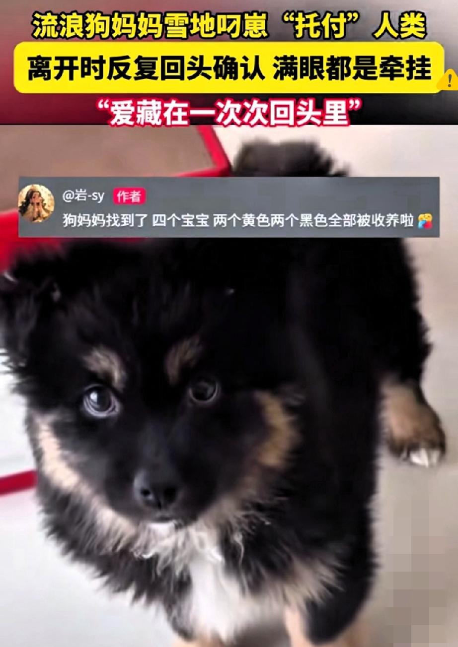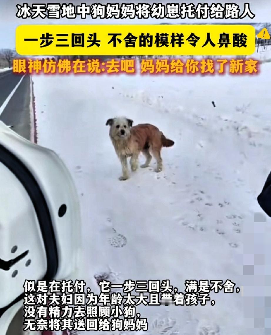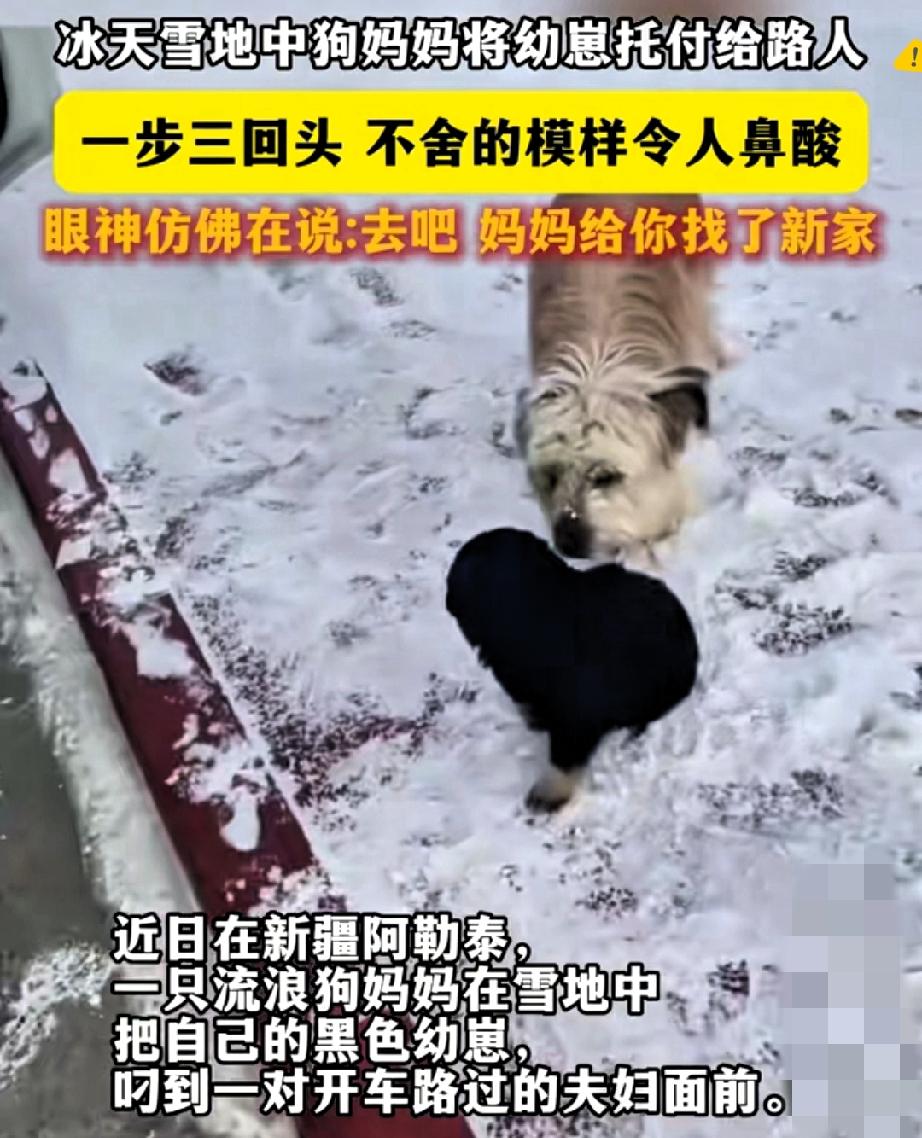 看哭了! 新疆大雪天里的这一幕,真的把“母爱不分物种”焊死在我心里! 车主路边停车赏雪,两只流浪狗突然冲过来,大狗叼着小狗一个劲往他跟前送,那急切的样子,像是在拼命托孤。 谁能懂啊,动物的母爱从不是盲目守护,而是清醒的抉择。 冰天雪地里找不到食物,大狗知道自己护不住孩子,竟鼓起勇气找人类求助,放下小狗后一步三回头地跑开,那不舍的模样,比任何语言都戳心。 更暖的是车主一家的善良从不敷衍,不仅立马收下小狗,还特意折返找到大狗和另外3只狗崽,全部妥善安置。 这哪是简单的收留,分明是双向的信任与救赎——大狗赌对了人类的善意,车主一家也接住了这份沉甸甸的母爱。 原来最高级的善良,是不辜负每一份绝境中的托付。 如果你遇到这样的流浪动物,会愿意伸出援手吗?