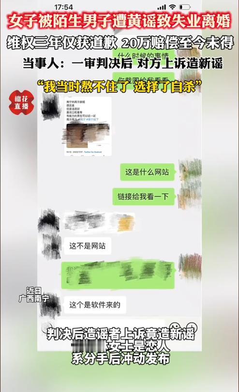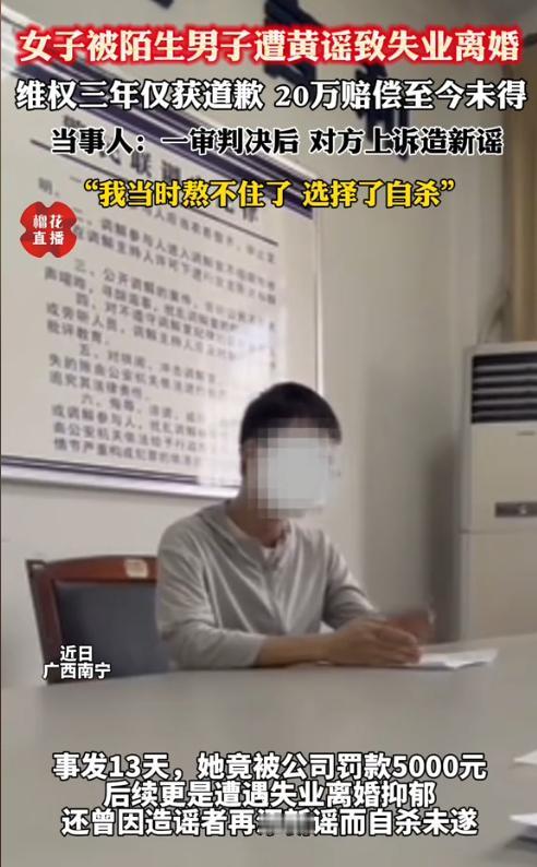 广西南宁,一女子的照片被人盗用并配文“提供有偿服务”,后骚扰者络绎不绝,导致女子被公司罚款5000元,后来连工作都没了,家庭也因此破裂。不仅如此,造谣者还坚称与女子是恋人关系,因为分手才报复的,可女子压根不认识造谣者。女子不堪压力,写下遗书吞服安眠药自杀,所幸被救了回来。后来女子虽然起诉造谣者获赔20万元,但造谣者身无分文,仅被拘留了15日以及登报公开道歉。(来源:榴花直播) 林女士长得十分漂亮,身材也不错,她偶尔会在朋友圈晒一些自拍照。2021年的一天,林女士正在公司上班,她的手机微信突然收到了几十条陌生好友申请,备注是:“外网有你的照片,加我私聊。”“你的照片在网上火了。” 林女士感到莫名其妙,自己的照片只在个人社交账号上发一发,从来没发过外网,但出于好奇她还是选择与陌生人沟通,想了解清楚真相。 令她没想到的是,通过陌生人提供的一些截图,以及电话联系解释,林女士才得知自己的生活照被人配上了“有偿服务”的露骨文字,甚至底下还有联系方式,评论区内全是不堪入目的留言。 林女士不知道是谁将她的照片这样恶搞到外网,可还没等林女士有所动作,有公司同事突然传来消息,说有个公司客户询问林女士网上的是不是真的。 随后不久,公司就给林女士发了一份处罚通知,称林女士的私人生活照在网络上引起了巨大舆论,已经影响了公司的形象,所以对其罚款5000元,并警告一次。 公司的处罚让林女士既气愤又无奈,最后她只能选择辞职。 然而林女士虽然辞职了,但那些照片的影响一直都在,而且也越演越烈,网上又出现了带林女士头像的不雅照片,虽然一看就是P的,但很多人信以为真,就连孩子幼儿园的家长群都在疯传此事。 这个时候作为丈夫,本应该坚定地站在林女士这边,给予信任和关爱,可丈夫也开始怀疑林女士生活不检点,这让林女士心灰意冷,最终选择了离婚。 短短的几个月时间,林女士的生活发生了翻天覆地的变化。林女士也报警了,但由于那些照片都是发在外网上的,警方也束手无策。无奈之下,林女士只得自己寻找那名造谣者。 林女士自己开了小号去各大网站蹲点,最终蹲到了一个可疑账号。随后林女士通过录屏,搜索IP地址等将一系列的证据交给了警方。 同时,林女士将证据发布到网上,试图还自己一个清白,可没想到网上一群人开始对林女士实施受害者有罪论,不论林女士如何解释,他们就相信造谣者的话。 2023年,警方终于将造谣者黄某抓获归案。林女士与黄某也达成了协议,要求黄某赔礼道歉,消除影响,恢复林女士的名誉。 可没想到,黄某并未赔礼道歉。后警方对黄某采取了行政拘留10日,罚款500元的处罚。林女士这边也提起了诉讼,要求黄某赔礼道歉,恢复名誉,赔偿损失。 一审法院经审理后,判决黄某应当公开道歉并赔偿林女士20万元。万万没想到,黄某竟然提起上诉,称自己和林女士原本是恋人关系,因为林女士抛弃了他和别人结婚生子,所以才想要报复。 林女士看到黄某的上诉状后,简直气坏了。林女士表示:我连他是谁都不认识,怎么会是恋人? 一次次被造谣,一次次努力澄清,这两年时间让林女士逐渐精神恍惚,她不堪重负写下了遗书,吞了大量安眠药,打算离开这个让她痛苦的世界。幸好家人发现得早,将她救了回来。 后来二审开庭,法院维持了一审判决,要求黄某公开道歉,并赔偿林女士20万元。可案件虽然胜诉了,但林女士在申请执行时发现,黄某连一点财产都没有,所以这20万元赔偿无疑成了空头支票。 有不少网友表示,造谣一张嘴,辟谣跑断腿,然而从这个案件来看,就算辟谣了,也有很多人会受害者有罪论,这就是人性的恶。 还有网友建议,造谣导致他人家破人亡的,必须判刑,否则让人难以释怀。 那造谣诽谤如何才能定罪量刑? 《刑法》第246条规定,以暴力或者其他方法公然侮辱他人或者捏造事实诽谤他人,情节严重的,处3年以下有期徒刑、拘役、管制或者剥夺政治权利。 其中“情节严重”是指同一诽谤信息实际被点击、浏览次数达到5000次以上,或者被转发次数达到500次以上的;造成被害人或者其近亲属精神失常、自残、自杀等严重后果的;二年内曾因诽谤受过行政处罚,又诽谤他人的。 林女士曾因黄某给她造黄谣服安眠药自杀,而林女士的工作、家庭都是因为黄某给她造黄谣而没了。 由此可见,黄某的犯罪行为已经达到了情节严重的程度。 因此,林女士的确可以指控黄某构成诽谤罪。 不过,诽谤罪属于亲告罪。必须有受害责任林女士自行搜集证据后,向法院提起刑事诉讼。 目前,林女士已经向法院申请了执行悬赏,希望有人能提供黄某的财产线索,以便执行那20万元的赔偿款。