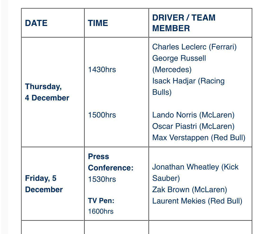 F1阿布扎比站周四车手发布名单:争冠三人组,FIA也是走心了2025f1阿布扎比大奖赛