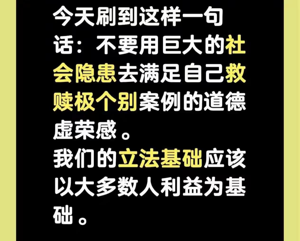 这才是法学生应该说的话吧,在刷到上一个老妖婆之后,再刷到这个,一下对法学生的思想改观了不少。 而下午的时候,遇到一个同事说! 法律是最低的道德要求! 法律只是道德的补充! 中华大地要禁止法律高于传统道德价值观! 中国绝大多数普通人的道德直觉才是法律的最高标准! 大家有怜悯之心是好事情,法学生有怜悯之心更是好事情,但是怜悯之心要针对人,对事,用刘天王某部电影的一句话,他们最爱装“可怜” 但是他们是真“可怜” 吗? 还有网上流传一句话,乱世先煞圣母,很多觉得是玩笑话,这是一句玩笑话吗?其实,这句话背后有着现实的警示意义。在如今信息繁杂的网络世界,“圣母心”泛滥的情况并不少见。一些人打着怜悯、同情的旗号,却不考虑事情的全貌和真相,盲目地为某些行为开脱。 就拿法学生来说,他们肩负着维护法律公正和社会秩序的重任。法律是经过严谨制定和论证的,它是社会公平正义的底线。如果因为所谓的“怜悯之心”而忽视法律的权威性,那法律的尊严何在?社会的公平又如何保障? 同事说的“法律是最低的道德要求”,这其实强调了法律与道德的关系。道德是一种更高层次的行为准则,而法律是确保社会基本秩序的保障。当道德无法约束某些行为时,法律就必须发挥作用。但绝不能因此就认为法律要低于传统道德价值观,两者应该是相辅相成的关系。 中国绝大多数普通人的道德直觉确实反映了社会的公序良俗,但不能将其直接等同于法律的最高标准。因为道德直觉往往是主观的、感性的,而法律需要的是客观、理性的判断。 那些最爱装“可怜”的人,他们利用人们的怜悯之心来达到自己的目的。比如一些诈骗分子,他们编造悲惨的故事骗取他人的同情和钱财。如果我们被他们的“可怜”表象所迷惑,那不仅会让自己遭受损失,也会让真正需要帮助的人得不到应有的支持。 “乱世先煞圣母”,这句话虽然听起来有些极端,但它提醒我们要保持清醒的头脑,不能被泛滥的怜悯冲昏了理智。在面对各种复杂的社会现象时,我们应该用法律的眼光去审视,用理性的思维去判断,这样才能真正维护社会的公平正义。