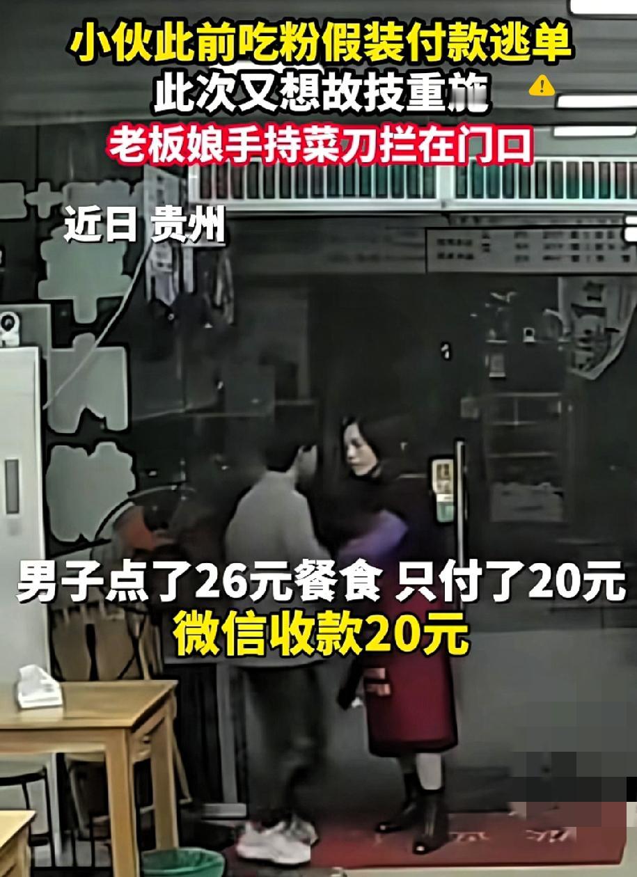 贵州孃孃这波操作太霸气了! 拿着菜刀擦着却不说话,专等二次逃单的男子自投罗网,这气场直接拿捏住了! 谁能想到男子上次逃单成功,这次还敢故技重施,假装付款想溜之大吉。 可老板娘早就认出他,没听到收款提示音就立马堵门,连少付的6块钱都没放过,既没纵容贪婪,又没逼人太甚,没要上次的饭钱,留足了余地。 其实做生意最忌讳惯着耍无赖的人,几块钱事小,践踏别人的信任和辛苦才最可气。 老板娘的“刚”不是凶狠,而是对诚信的守护——真有困难开口,大多老板都会心软相助,但故意逃单就是人品问题,就该被当场戳穿。 你觉得面对逃单,老板娘这样的处理方式够解气吗?