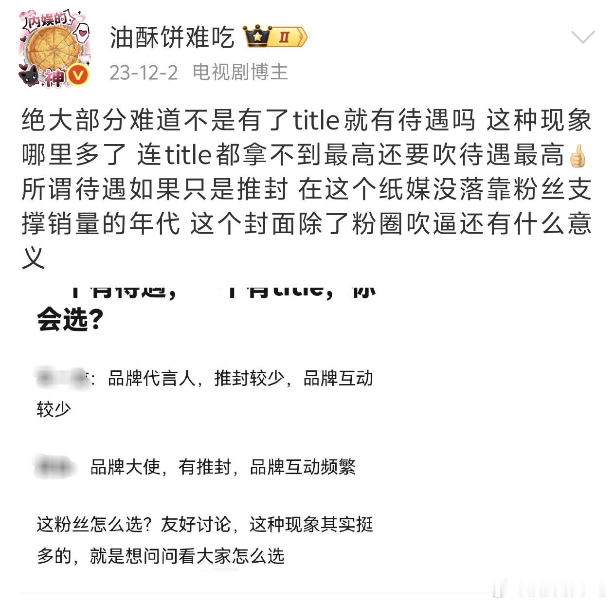 刚刚误入一个粉圈🌬️,粉丝说title虽然不如别人,但待遇更好突然想到我之前讨论过这个问题(他们的待遇好不特指推封还有各种杂七杂八的一堆拉出来) title都拿不到最高怎么好意思吹待遇最好的,待遇第一步且最关键的一环就是title啊