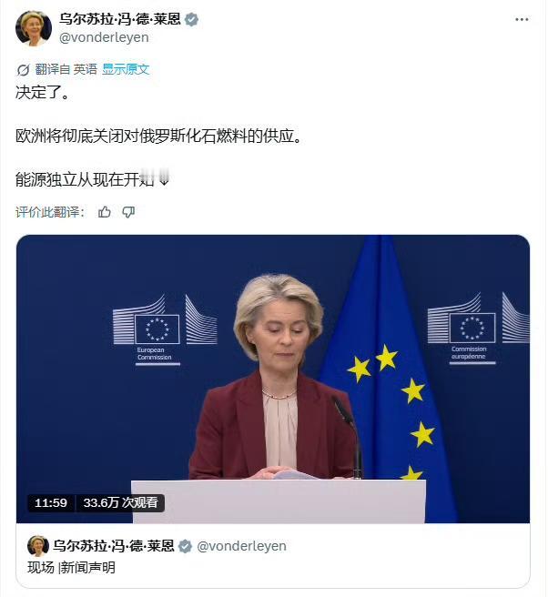 欧盟委员会主席冯德莱恩刚刚宣布了一个决定,一个听起来相当决绝的决定:“欧洲将彻底