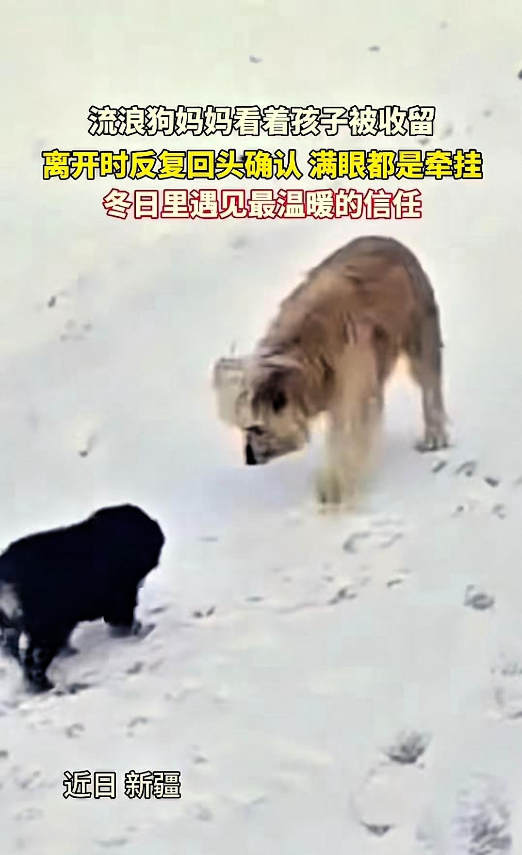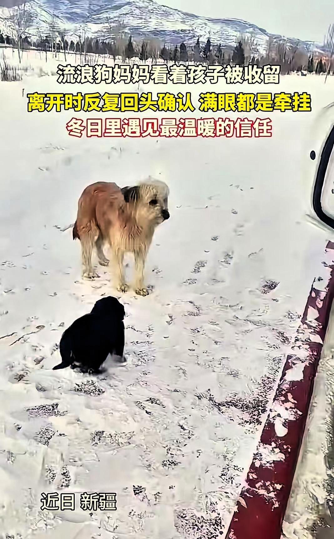 看哭了!”新疆,一车主刚在路边停下休息,接下来的一幕让他直接傻眼了:两只流浪狗突然跑到车前,大狗叼着小狗一个劲往他面前推 眼神里满是急切,车主很快明白,这是狗妈妈在为孩子寻求帮助。刚下过大雪的路边寒风刺骨,根本找不到食物,它知道自己难以护住幼崽,只能放下戒备,把孩子托付给陌生人。 确认车主没有拒绝后,大狗不舍地盯着小狗看了又看,随后转身慢慢跑开,每走几步就回头张望,满是牵挂。车主的孙子见状,立刻跳下车抱起小狗带回了车里。 事后,车主一家特意返回原地寻找大狗,不仅成功找到它,还发现它还有3只狗崽。他们当即决定将4只小狗全部收养,而大狗则被当地好心的牧民收留,算是有了个圆满的归宿。 这只狗妈妈的选择让人动容,它用简单的行动诠释了母爱的伟大。而车主一家的做法更显善良,他们的善意不是一时的心血来潮,而是实实在在的负责。 母爱不分物种,善良不分彼此。这个寒冷的冬日,这份跨越物种的信任与温暖,治愈了无数人。万物有灵,每一份真诚的善意都值得被善待。