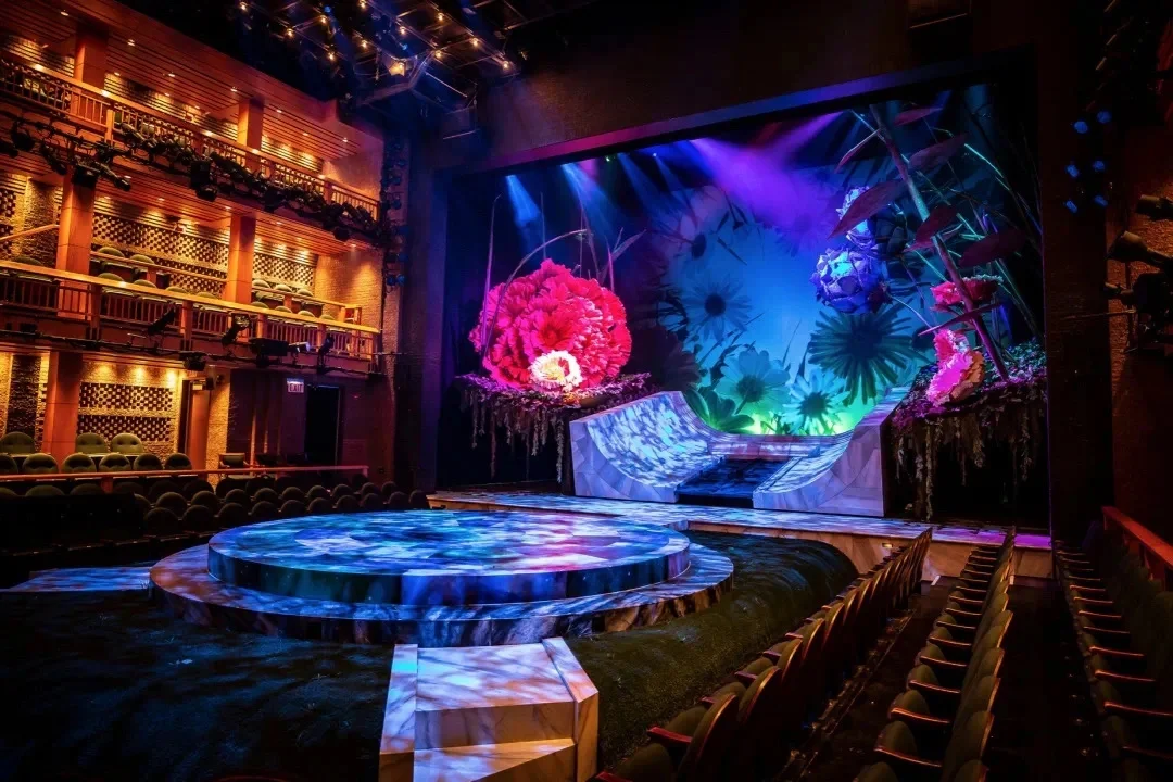 [四R]舞台上布置了巨型的花朵,加以不同色彩的灯光进行照射,整体营造出欢乐、奇幻的氛围。