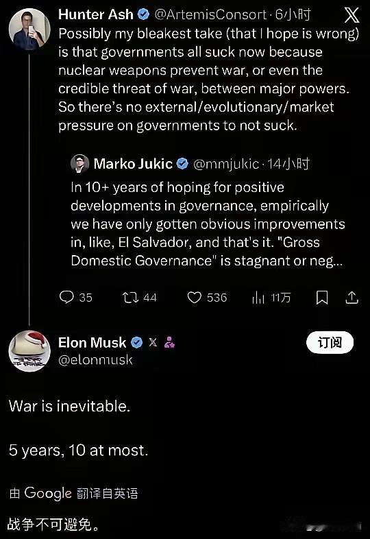 马斯克预测未来5-10年必有一场大战争! 全球已经进入经济大萧条,这导致战争几率越来越大,这是必然的,马斯克这话不是空穴来风,有迹可循的,参考一战二战发生的背景吧! 今天的世界太不太平了!我们生活在和平年代已经是幸运的了,谁知道战争什么时候发生!