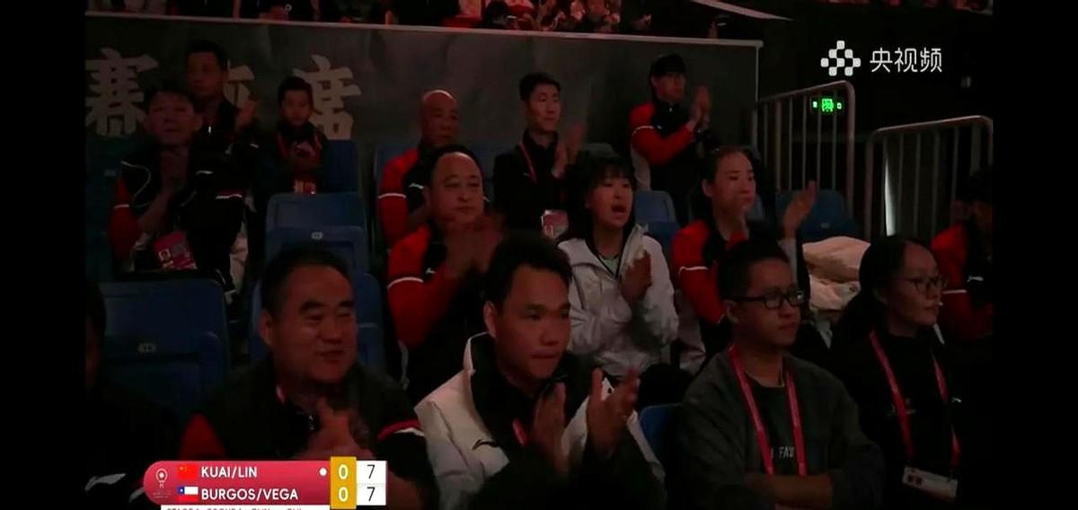 领导又来看比赛了,林诗栋蒯曼的混双首局,比分7:7时镜头一转给到了观赛席,首先映