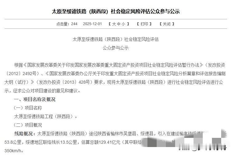 喜讯!两条高铁取得重大进展!看看经过你的家乡吗?下面我们来简单介绍一下: 一、太原至绥德铁路(陕西段) 太原至绥德铁路(陕西段)迎来实质进展。这条时速350公里的高铁线路正加快前期规划论证评估,项目将途经榆林市吴堡县和绥德县,最终接入在建的延榆高铁绥德西站。陕西段正线长约53.8公里,联络线长13.5公里,投资估算为129.41亿元,其中联络线投资占15.2亿元。工程预计耗时4.5年,全线设计时速350公里。 据悉,太原至绥德高铁整体线路起自太原南站,终点为延榆高铁绥德西站,全长约266公里。其中,既有太中银铁路段占27公里,新建部分为239公里,山西省内185公里,陕西省内54公里。项目计划新建太原西、潇河、文水、杏花村、吕梁南、柳林西等站点,最终站点设置将依据批复方案而定。该线路是国家“八横八纵”高速铁路网青银通道的核心构成部分,衔接京津冀-成渝主轴与京藏走廊的关键路段。 二、永清广高铁广东段 永清广高铁广东段亦传来好消息,预计2025年底开工。线路起自在建的邵永铁路永州站,途经湖南永州的零陵、双牌、宁远、蓝山等地,进入广东后依次经过清远市的连州、阳山、浸潭及城区,南行至广州市花都区,最终引入广州北站。正线全长390.327公里,湖南段157.425公里,广东段232.902公里。 全线拟设10座车站,包括永州、零陵、双牌东、宁远、蓝山、连州、阳山、浸潭(越行)、清远西及广州北站,其中新建车站7座,改建既有站3座,并配套新建广州北动车所。联络线工程长约9.611公里。项目总投资约951亿元,湖南段占295亿元,广东段占656亿元。 两条高铁项目的推进,将进一步强化区域交通网络,值得期待!