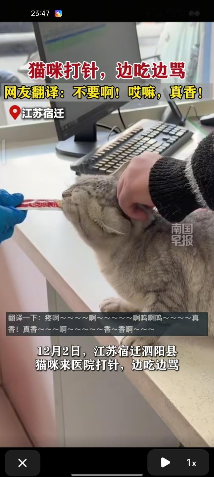 12月1日,宿迁市泗阳县。网友晒视频称,猫咪在医院打针,边吃边骂。这猫是前几天在路边捡的,猫咪状态很差,可能是生病了,于是带着猫去宠物医院治疗。目前猫咪状态稳定,如果后续没人来认领,就收养这只猫咪。