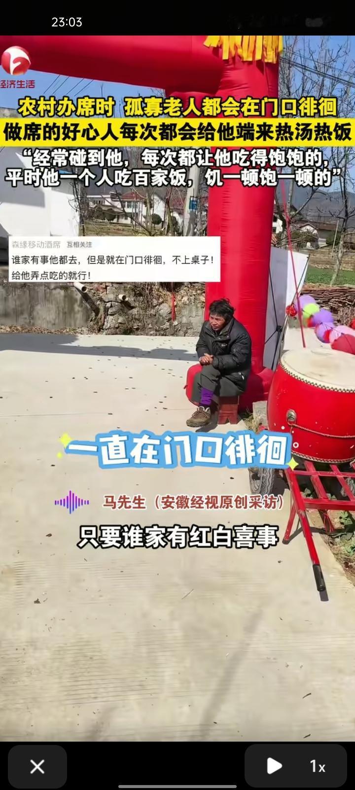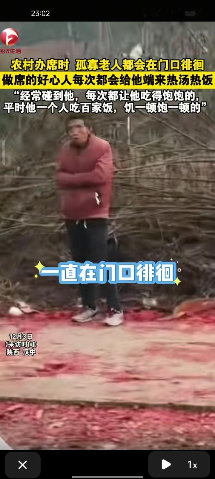12月2日,陕西汉中。农村办席时,孤寡老人都会在门口徘徊,做席的好心人每次都会给他端来热汤热饭。 马先生表示,只要谁家有红白喜事,他就去了,去了也不上桌就在门口徘徊。每次见他过来可怜,就一个人站在那里,就给他弄碗米饭和热汤。他平时一人吃百家饭,饥一顿饱一顿的