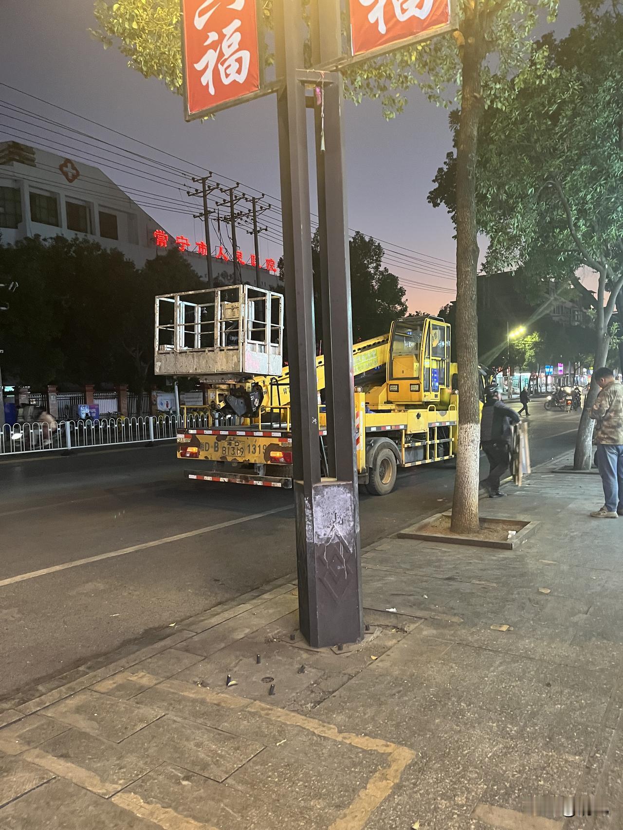 傍晚路过常宁街头,瞧见路灯杆边停着辆黄色高空作业车,工人师傅正忙前忙后。 旁边就是市人民医院,暮色里红色的招牌字还亮着。 路灯杆上挂着“福”字灯笼,地上落了俩小螺丝,师傅蹲在路边理工具,旁边有路人探头看。 天刚擦黑,街灯刚亮,晚风裹着点凉意,这普通的街头一幕,倒挺接地气——城市里的这些小修小补,不声不响地把日子填得扎实,连带着这“福”字都更暖乎了点。