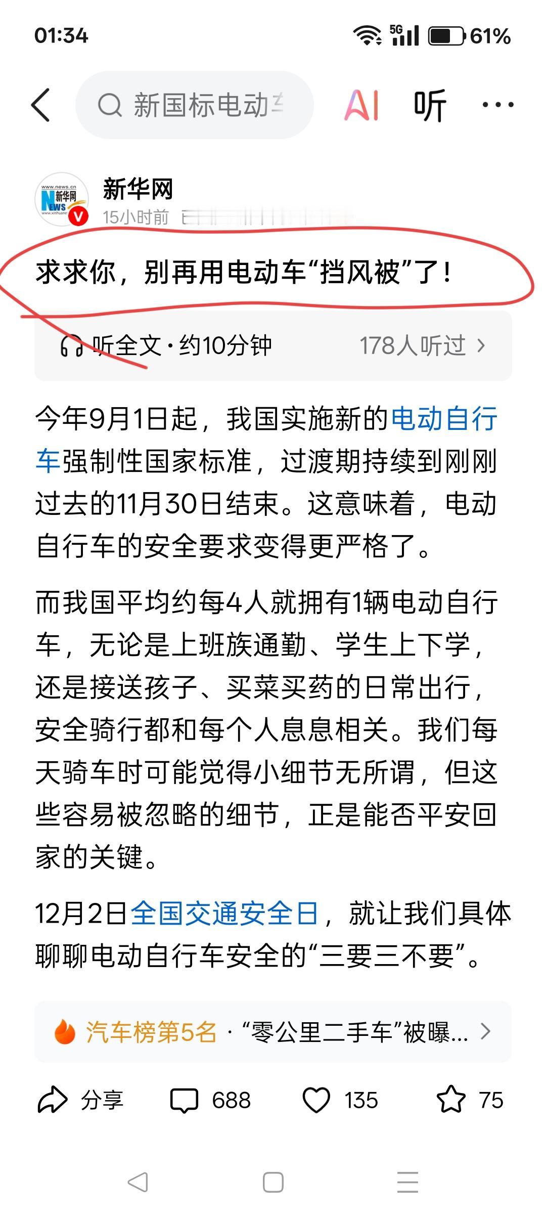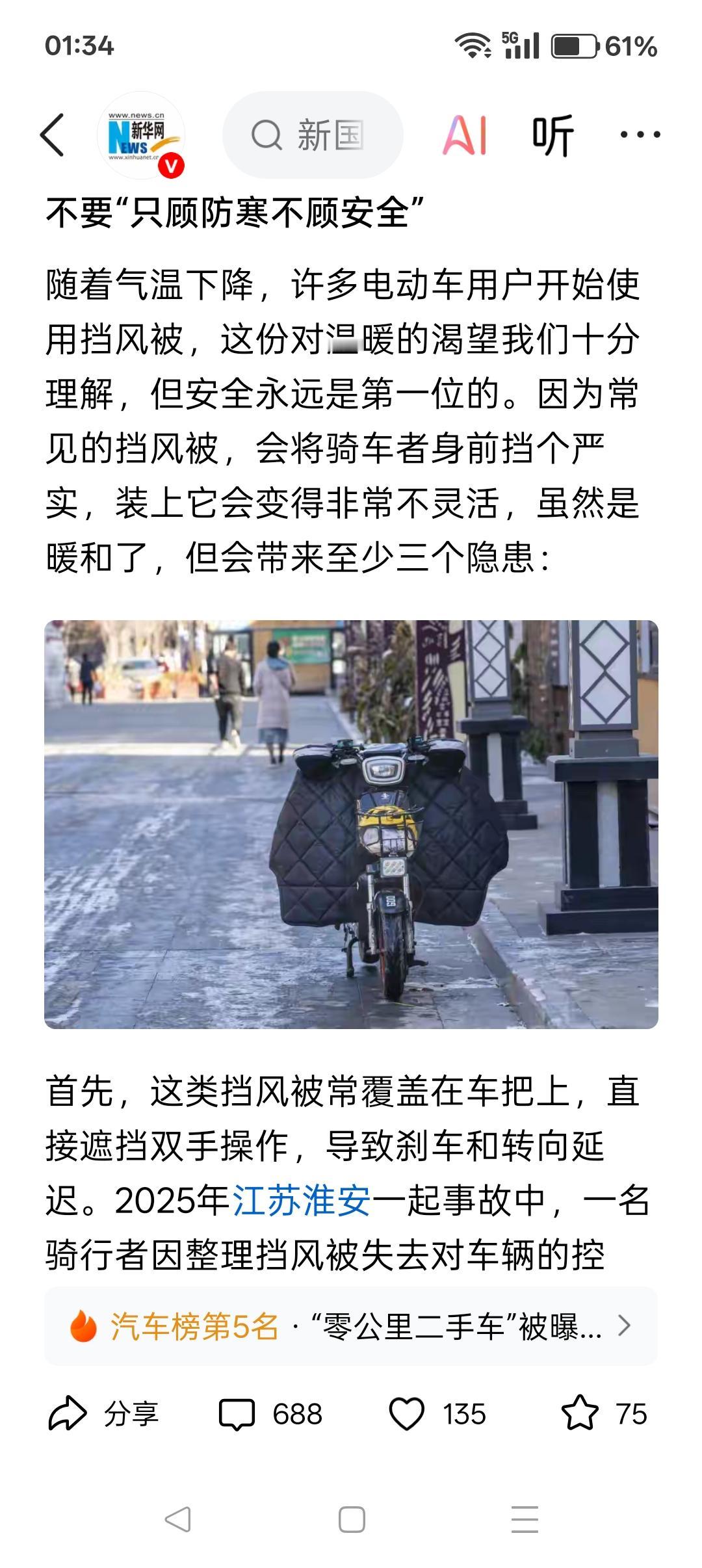 电瓶车用挡风被,不应被苛责! 指责电瓶车用挡风被,总让人觉得不近人情,有点强人所难。 挡风被对于随时骑电瓶车出行的人来说,不可或缺。挡风被能保暖防淋,当然比硬扛着淋雨受寒舒服啊。 如果因为挡风被造成过事故就反对,是因噎废食的思维。其实无论用不用挡风被,只要骑电瓶车就难保百分之百不出意外。出事还有骑手自身的运气原因——极低的概率事故恰好遇到了。 请看不用挡风被骑车有多遭罪: 天凉的时候(尤其是气温低于15℃),膝盖、手、后背直接吹冷风,骑几分钟就难受。长期下来,可能落下关节炎、老寒腿,中老年人、关节敏感者、正患病者(比如感冒发烧),更扛不住。 迎面吹寒风让人很不舒服,干疼不说,鼻炎、哮喘患者发作概率将增高。手指、耳朵冻得发麻,皮肤也会变得干燥粗糙。 冷得浑身发抖时,手指反应会慢0.3-0.5秒,刹车、转方向没那么灵活。赶上下雨,雨水打在脸上根本看不清路,碰撞风险直接翻倍…… 挡风被导致的安全问题: 有数据说,全国一年大概10.2万起电瓶车事故和挡风被有关。但2025年电瓶车保有量约3.8亿辆,对应比例约0.0268‰,这比例实在是低得可怜。 这里还有个关键:这些事故里,80%以上是那种裹住手、裹住腿的连体款,或者宽度超60厘米的超大挡风被,骑的时候卷进车轮、卡住车把,才出了事。 要选对款、用对方法!最好选用分体式、不挡车把刹车的款式,安装牢固不影响操作。正确使用的事故概率比无防护低,甚至比雨衣风险还小。 记住两点就行:一是选宽度≤50厘米、不缠绕车把车轮的非全包款;二是安装后检查刹车和转向灯,车速正常不超速,雨天大风天多留意路况。 所以说,挡风被绝对不是“危险品”,反而是好帮手。只要正确用,既保暖又安全! 某媒体发文《求求你,别再用电动车“挡风被”了!》,其说法过于片面,只看弊端不论益好,忽视了挡风被的诸多好处,作者可能是平时不骑或者说很少骑电瓶车的人!