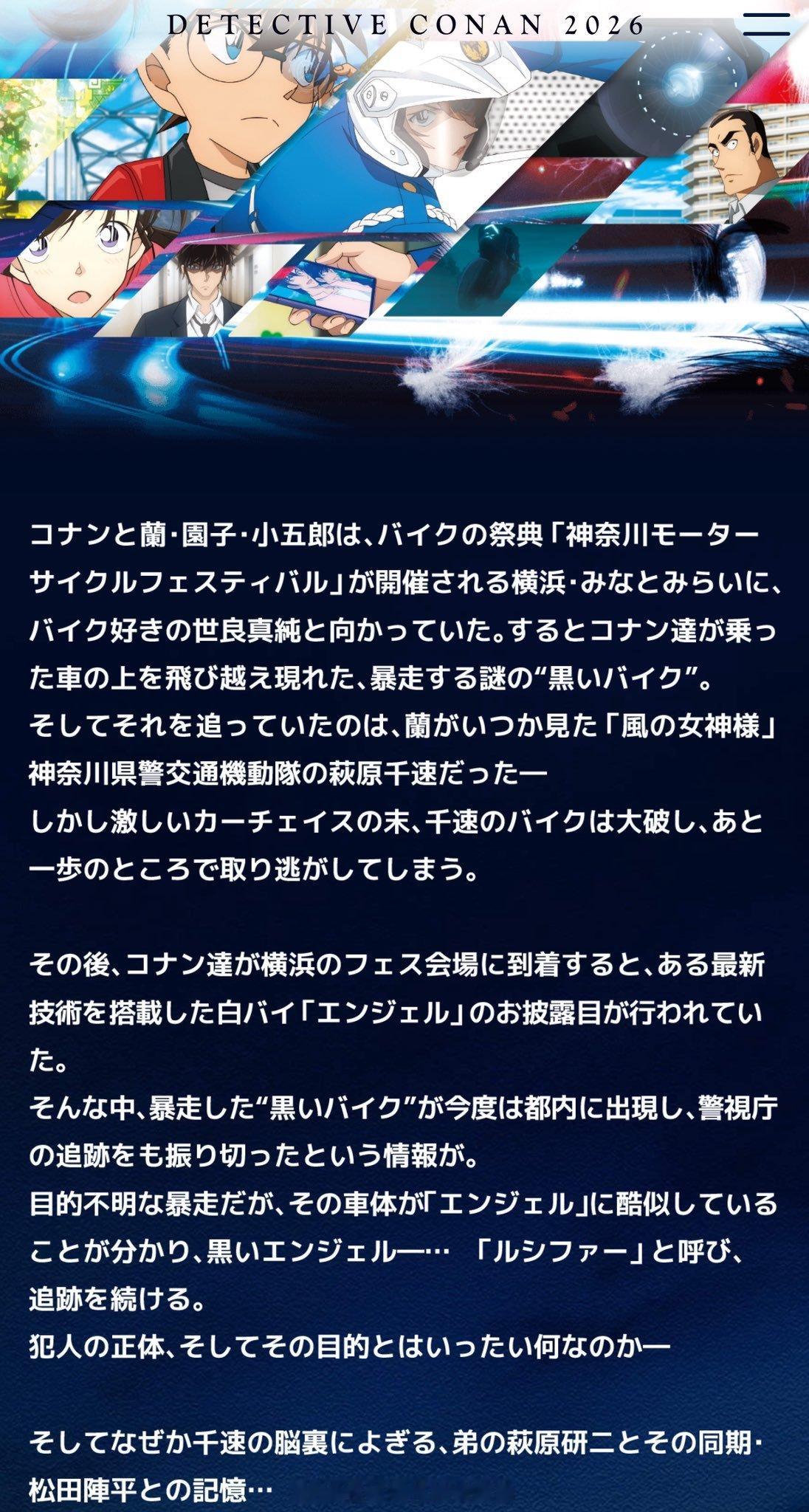 名侦探柯南第29部剧场版《高速公路的堕天使》剧情简介公开:柯南、小兰、园子、小五郎,与喜欢摩托车的世良真纯一同前往横滨·港未来,参加摩托车庆典“神奈川摩托车循环节”。这时,一辆神秘的“黑色暴走摩托车”从柯南等人乘坐的车上方飞跃而过,而追捕这辆车的,是曾被小兰见过的“风之女神”——神奈川县警交通机动队的萩原千速。然而在一场激烈的追车戏之后,千速的摩托车严重损坏,黑色摩托车在最后一步逃脱了。之后,柯南一行人抵达横滨的活动会场,看到了搭载最新技术的白色摩托车“天使(エンジェル)”的发布活动。就在此时,传来了那辆暴走的“黑色摩托车”现身都内、甚至摆脱了警视厅追捕的消息。虽然这是一场目的不明的暴走,但众人发现这辆车的车体与“天使”高度相似,于是将其称为“黑色天使——鲁西法(ルシファー)”,继续展开追捕。犯人的真实身份,以及他的目的究竟是什么——而不知为何,萩原千速的脑海中浮现出了关于弟弟萩原研二,以及他的同期松田阵平的记忆……