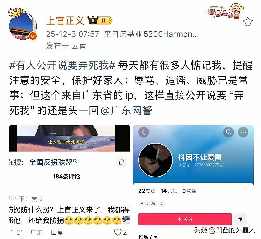 威胁打拐英雄的黑手 真是越挖越吓人 不查不知道,一看才明白 上官正义,一名打拐工作者,18年来坚持打拐,先后自掏腰包30万,深入黑产窝点,救回200多个被拐儿童。他不仅仅救回被拐儿童,还揭露出43家问题医院,端掉长沙代孕窝点,救出9名聋哑姑娘,曝光无锡婴儿买卖。在近几日的工作中,上官正义遭到黑产威胁,黑产出2千万买命,还要注射艾滋血追杀上官正义,并扒出他家人的信息。杭州警方已立案,但黑产仍在暗处活动,这说明什么?这说明黑产非常忌惮上官正义,上官正义越曝光他们的罪行,他们就越忌惮!