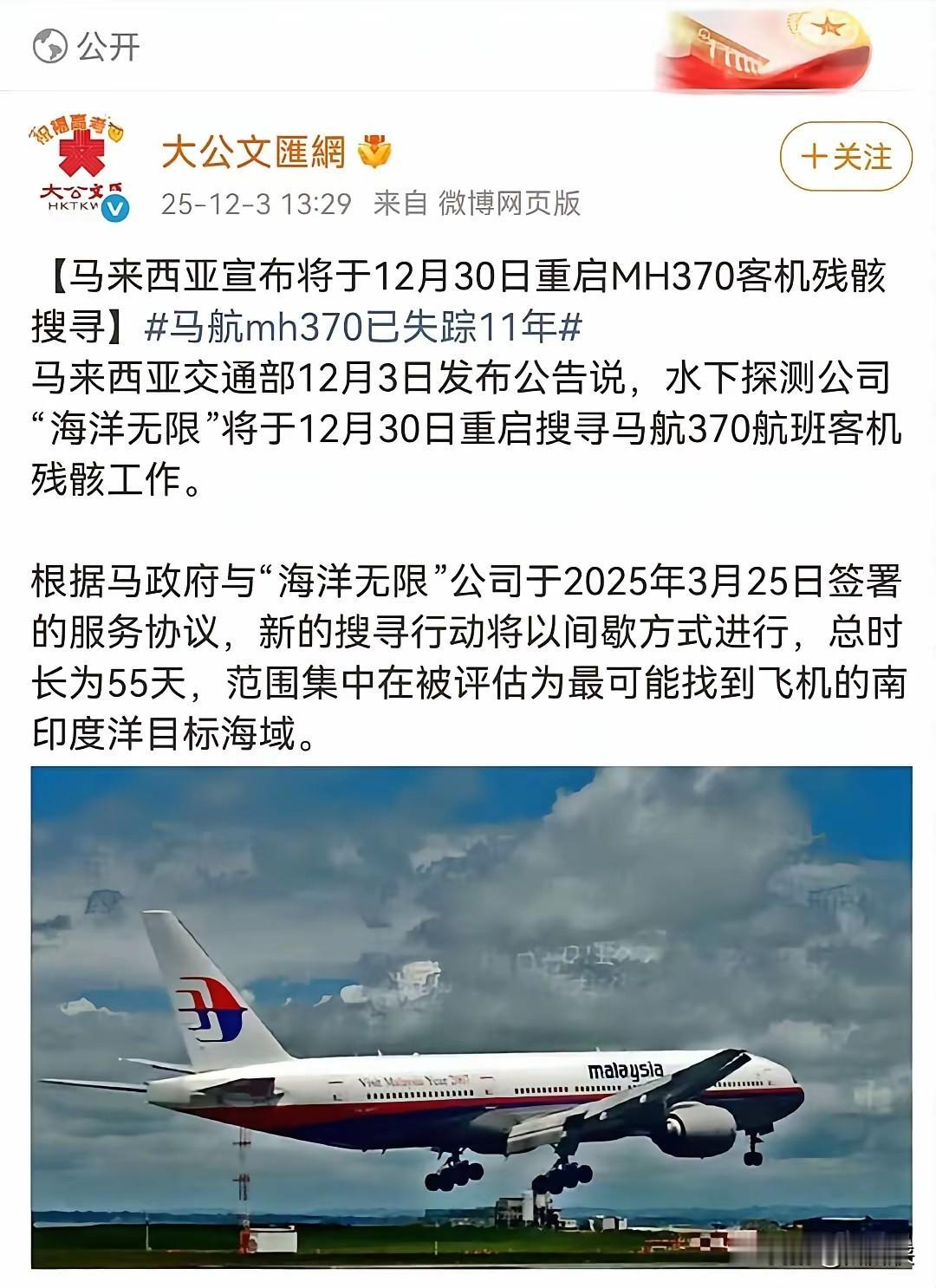 马航370突然重启搜寻,真是因为“刚知道”在哪儿吗?我琢磨着,事情或许没那么戏剧,但也绝不简单。 十一年了。当年上学的小孩,如今已在职场摸爬滚打;当年乌黑的头发,悄悄爬上了霜。时间能推着人往前走,可那些始终没等来一声“到了”的家庭,他们的钟,仿佛永远停在了2014年3月8号。 为什么现在又开始找?说“一开始就知道地点,现在才公布”,这像极了电影桥段,可现实往往更平实,也更复杂。科技这玩意,十年足以翻天覆地。当年的水下无人机,放现在可能都算“老古董”了。搜索范围不是一蹴而就缩小的,那是用一次次失望、一遍遍计算、一寸寸海域,硬生生给熬出来的。至于国际合作,打破壁垒?不如说,是那份“必须有个答案”的执念,暂时压过了各自的心思。 哪有那么多惊天阴谋。更多时候,是人类面对巨大谜团时,那种不甘心的倔强在推动——我们总得给牵挂一个交代,给悬而未决的故事,画上一个句号。哪怕这个句号,残酷且冰冷。 真相或许很痛。它可能揭开技术瑕疵,或是暴露系统脆弱,甚至指向某个无法言说的失误。但对于等待的人,“不知道”本身,就是一种凌迟。确认残骸,找到黑匣子,不是结局,却是哀悼的起点。它让告别得以成立,让悲伤能够落地。 逝者已逝,我们所有的寻找,说到底,是为了还活着的人。为了他们能有一天,把那颗悬了十多年的心,轻轻地、重重地放下。 你说,这漫长的等待,我们找到的最终会是答案,还是更多疑问?如果真相揭开,它治愈的会是谁,又或将刺痛什么?马航MH370事件将正式开庭