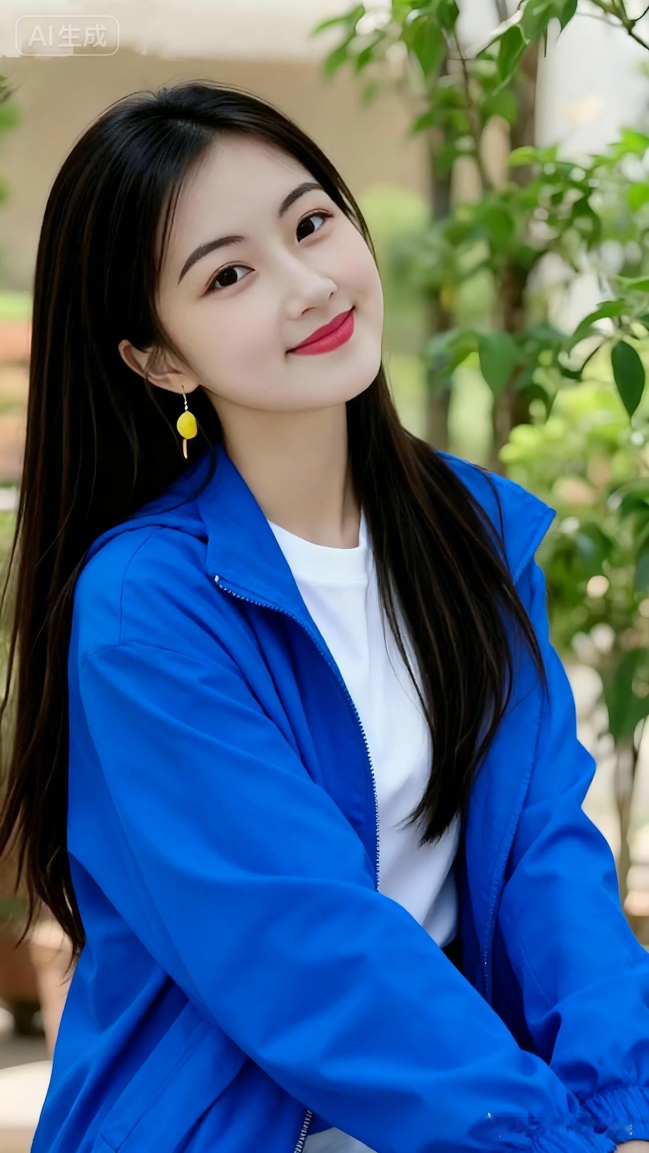 美女身着蓝色外套,内搭白衫,侧身慵懒落座于桂花树旁,眉眼含柔,衣袂与花香相融,清婉雅致。