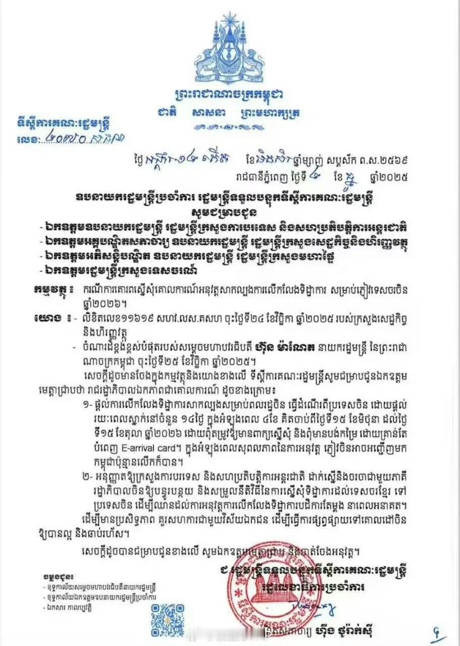 12月2日晚,柬埔寨网络广泛流传一份政府公告,内容显示柬埔寨将于2026年6月15日至10月15日期间对中国公民试行免签政策。 文件称,柬埔寨政府同意对从中国前往柬埔寨的中国公民试行免签政策,允许停留14天。在4个月试行期内,中国公民无需申请签证,也无需缴纳任何费用,只需填写电子入境卡即可入境,且可以多次入境柬埔寨。 柬单网记者向多位旅游业界进行核实后确认,文件内容应为真实政策,但尚未正式对外发布。 柬埔寨政府指示外交与国际合作部与中方继续磋商,推动未来实现中柬双边互惠免签,并争取进一步简化柬埔寨公民赴华签证流程。旅游部和相关行业也将加大对中国市场的宣传投放力度,吸引更多中国游客重返柬埔寨。
