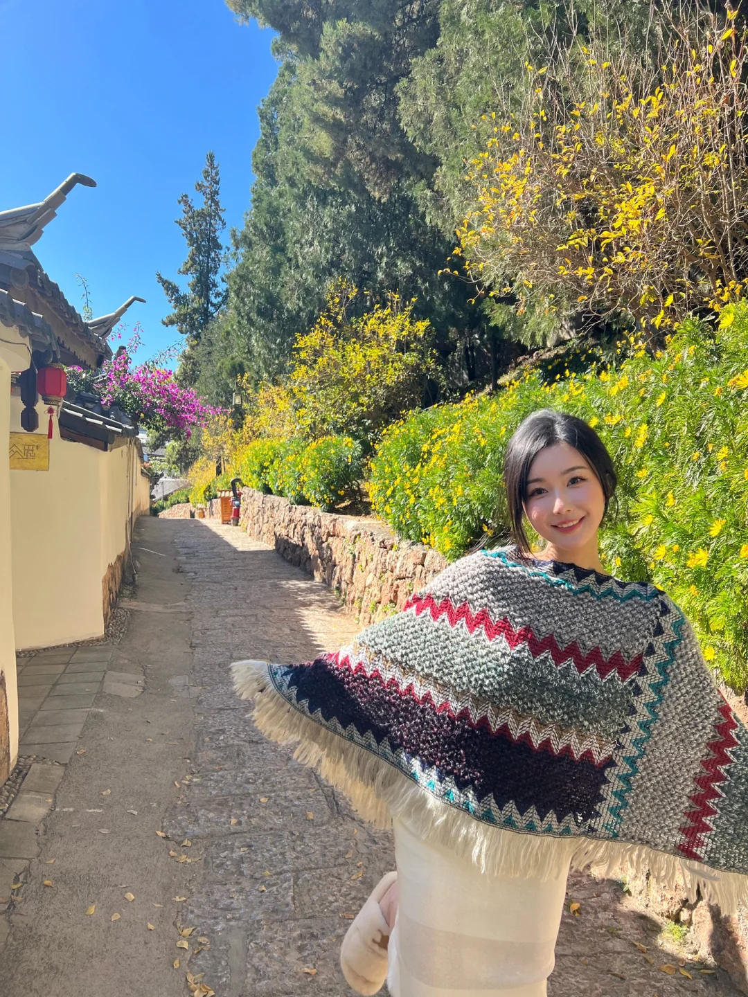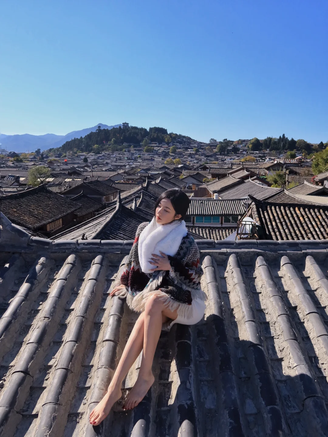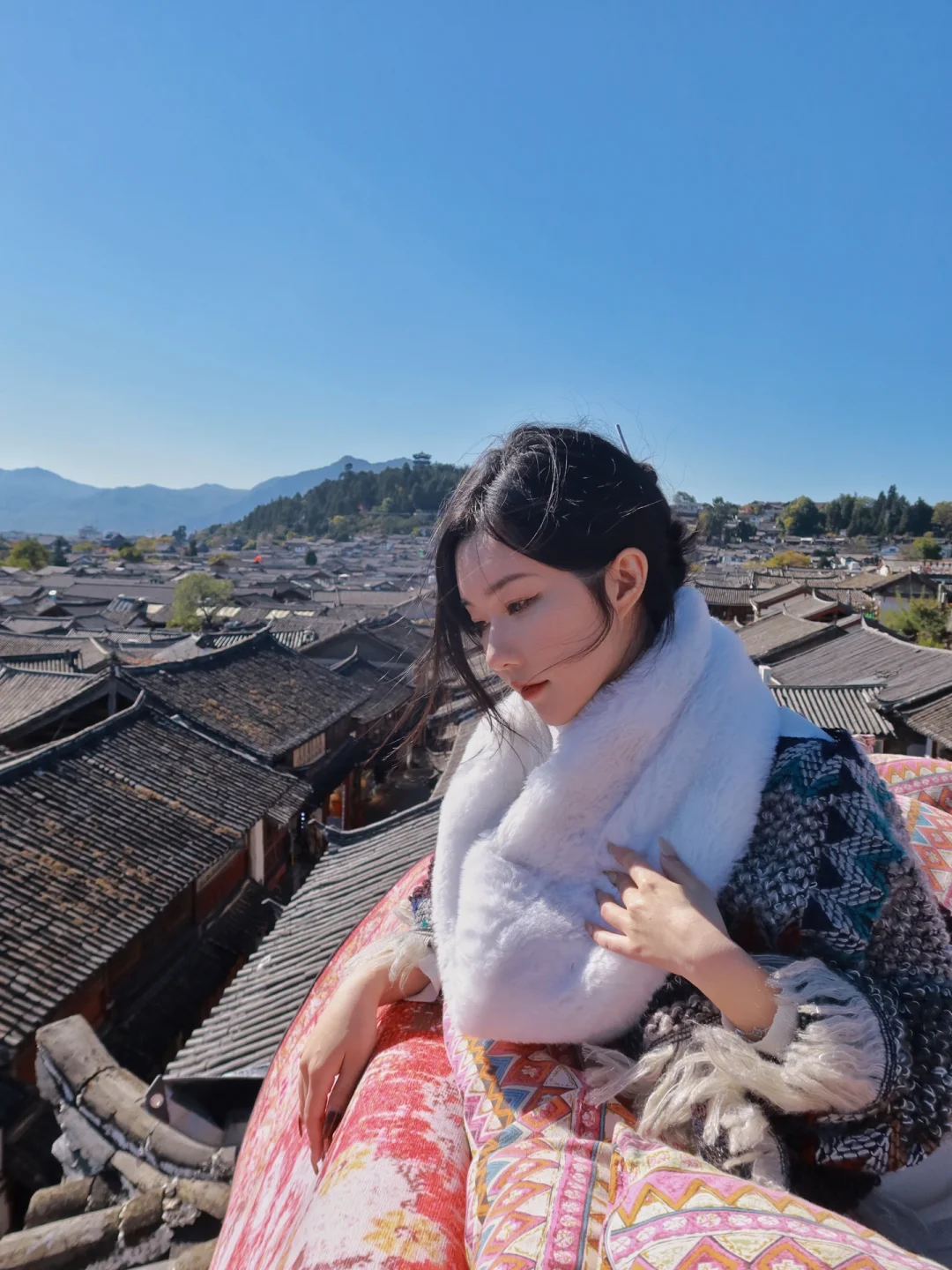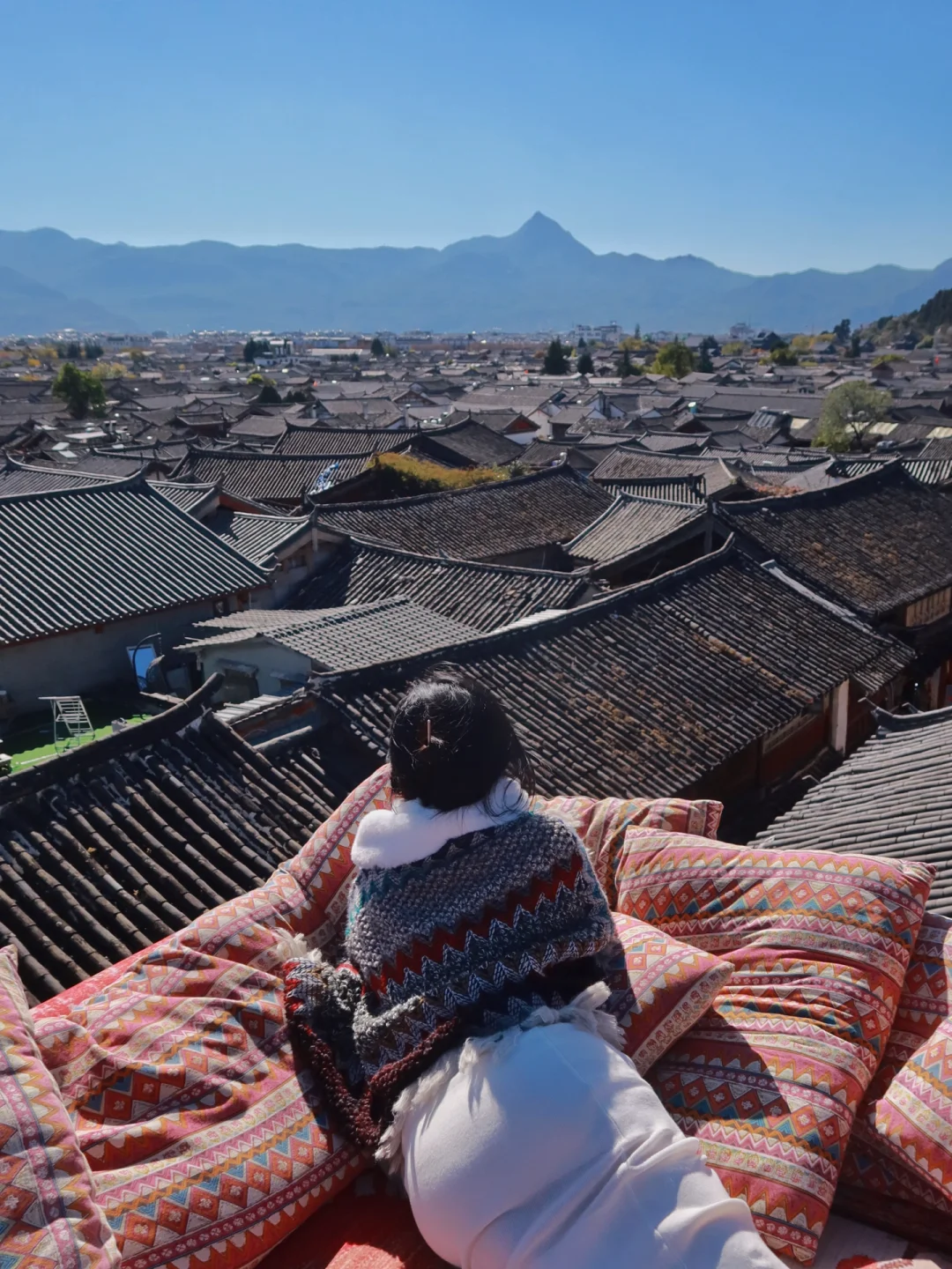 丽江大研古城内有许多天台都可以拍这种俯瞰丽江城景的店 这一家现在淡季人均只要30元 不限时间而且一个人都没有 可以自由发挥随意拍拍拍 店内还可以提供民族服饰 请店里摄影师的话需要额外收费哈 - 📍导航搜破天台 一楼是个咖啡店也没有招牌 问一下店员就会带你上去啦 - 📸 我是中午去拍的 还没完全的背光 上午顺光下午逆光 虽然说顺光光线好 但眼睛实在是睁不开 -