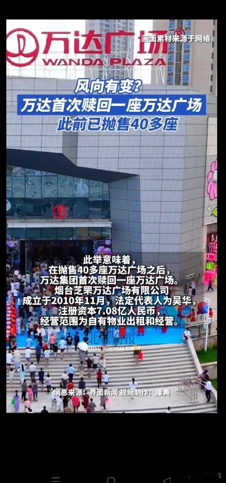 王健林再次出手,这次不是卖万达广场,而是赎回 万达赎回烟台芝罘万达广场,这事太值得说道了 2023 - 2025年,万达为应对债务和现金流压力,累计卖了超80座广场,2025年5月一次就打包卖了48家,那时候真是“断臂求生”。按每个广场约15亿估值,这可是巨额资产。 但在2025年12月,万达全资控股了这座曾出售的广场,这是自大规模资产出售后首次公开报道的赎回案例。再结合王健林限高令解除,看来老王资金是缓过来了。说不定万达又能重回巅峰,接着在商业地产界叱咤风云了。对此大家有什么看法?欢迎评论区留言! 万达广场 万达 万达商业广场 万‌达