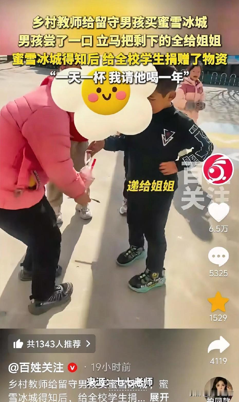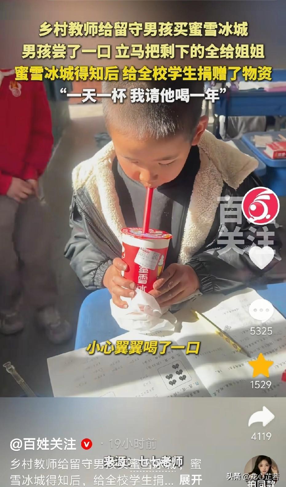 近日,河南周口,一名乡村女教师心酸地发现,她给男孩买的蜜雪冰城仅仅喝了一口,又放回袋子里。男孩是一名留守儿童,和爷爷奶奶一起生活,家里条件不太好。 男孩这周的进步特别大,他平时比较调皮,上课爱做小动作,但是老师批评一次之后立刻就改正了。男孩的心愿就是喝一次蜜雪冰城。 老师来到镇上的蜜雪冰城,帮男孩实现愿望。老师表示,懂得知错就改、努力向上的孩子值得得到奖励。没想到,他仅仅喝了一口就系上袋子,说要拿去送给三年级的姐姐喝。 老师表示,这位男孩9岁了,好像早早穿上了大人的铠甲,此时小小的他已经是大大的男子汉。希望这杯暖暖的奶茶,在寒冷的天气能暖到孩子的心,增强他们的学习动力。 没想到的是,“雪王”真的带着礼物来看孩子了。他们为了照顾到全校的师生,送来了文具和暖手枕之类的物资。今年的冬天才刚刚开始,可却是格外温暖。 看了视频,这事儿感觉暖乎乎的!乡村教师的一杯蜜雪冰城,是把对留守儿童的疼爱藏进了甜里,没有复杂的举动,却戳中了孩子缺爱的心;男孩尝一口就送给姐姐,更是小男子汉气概的表现,姐弟俩的相互牵挂比奶茶还甜。 蜜雪冰城的做法太圈粉了!没有只当营销噱头,而是真金白银给学校捐物资,还许下“请喝一年”的承诺,既接住了这份善意,又把温暖放大到更多孩子身上,让小美好变成了大感动,这才是企业该有的温度。 其实善良从来都是会传染的:老师的一点温柔,孩子的一份谦让,企业的一次接力,凑在一起就是最动人的画面。这事儿也告诉我们,不管是小事还是大行动,只要心里装着别人,就能让日子过得更甜。(来源:百姓关注)