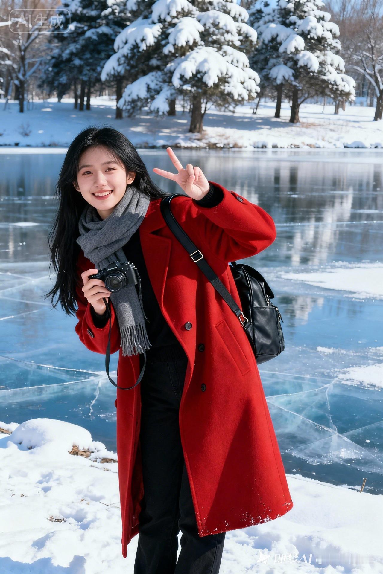 年轻女子手持相机比耶。雪地、冰湖、树木,尽显冬日清新,元气满满。