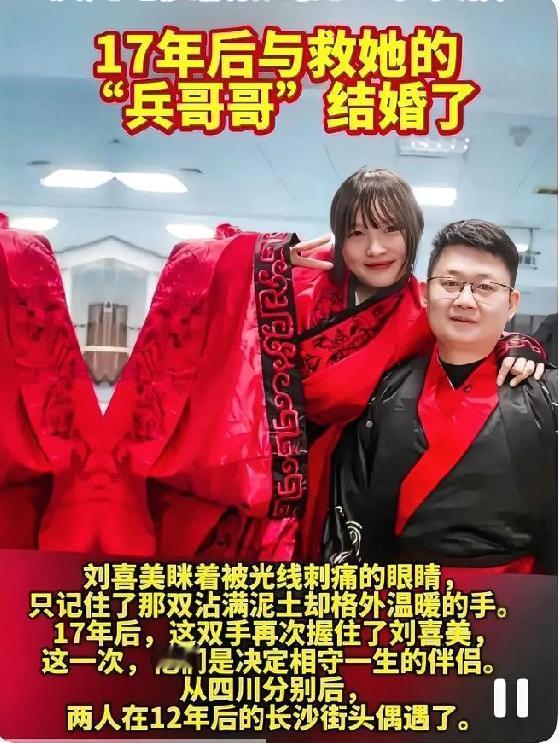 缘分这东西说来也真奇妙: 17年前汶川地震被救的10岁女孩, 12年后与救她的军人喜结连理! 当年地震发生后,10岁的小女孩刘喜美被22岁的军人梁智斌从坍塌的废墟里给拉了出来。谁能想到呢,12年之后,这两个人居然在长沙的街头不期而遇,从当年的救命恩人,慢慢处成了要过一辈子的情人! “当时我就记得他手上全是泥,可那双手摸起来特别暖和,像揣着个小太阳似的。”刘喜美笑着说。时间拨回到2020年快到年底的一个傍晚,她正和爸妈坐在餐馆里吃饭呢,妈妈忽然瞅见邻桌坐着个男的,长得跟当年救她的人太像啦,赶紧拉着她主动过去搭话认亲,后来就互相加了微信。 一开始梁智斌没多想,就把她当亲妹妹似的照顾着,结果刘喜美那张笑脸像太阳一样,一点点把他心里的冰都给化了。虽说两人差着12岁,可他们就靠互相理解,愣是把年龄差造成的小隔阂给磨没了:他跟着学年轻人玩的网络词,她就陪着他去看车展、拼乐高模型,日子过得热热闹闹。 “我跟他在一起,不是为了报恩,就是相处着相处着,觉得这个人就是能托付一辈子!”今年春天的时候,他们办了场传统的汉服婚礼,当年那双从废墟里拉她出来救人的手,现在正牵着她一步步走向好日子呢。从当年的生死一线到现在的相濡以沫,这样的缘分,是不是特别让人羡慕?你觉得呢?