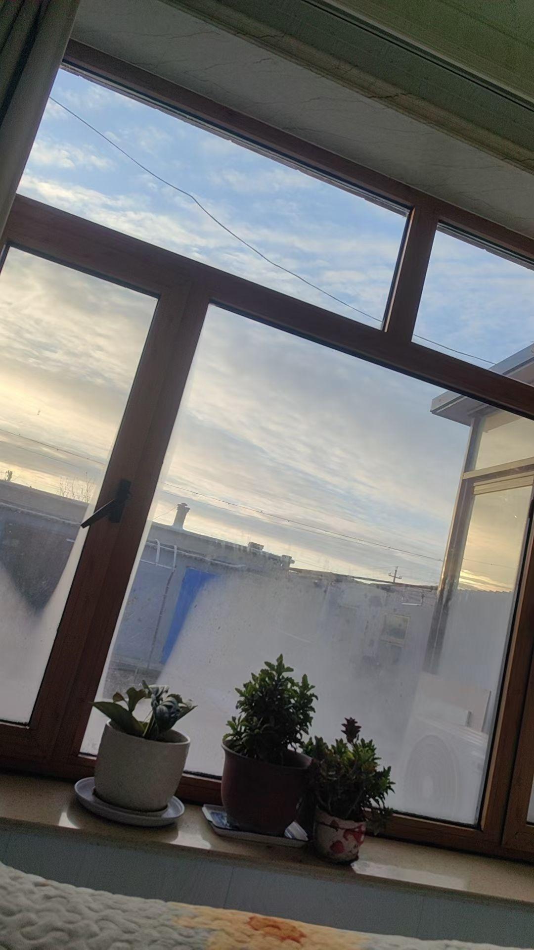 窗台上放着几盆绿植,外面阳光明媚。